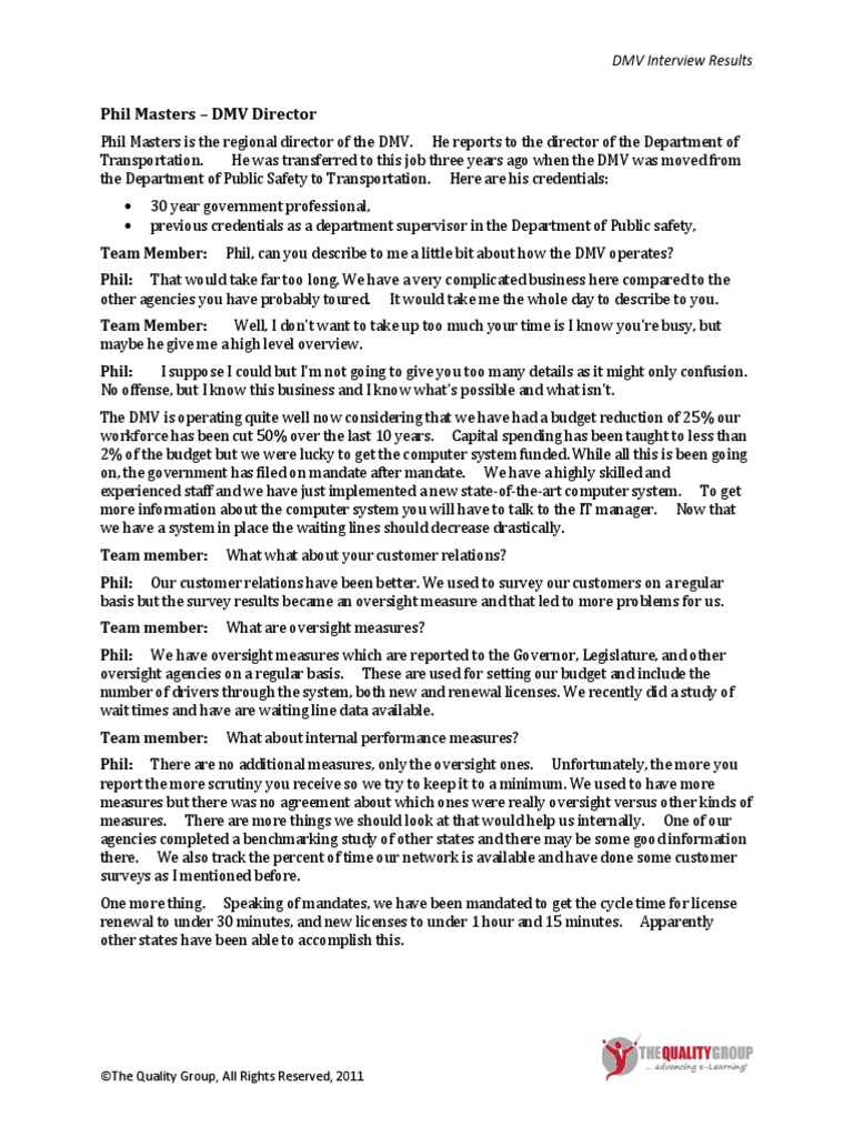 The DMV is operating quite well now considering that we have had a budget reduction of 25% our workforce has been cut 50% over the last 10 years. Capital spending has been taught to less than 2% of the budget but we were lucky to get the computer system funded. While all this is been going on, the government has filed on mandate after mandate. We have a highly skilled and experienced staff and we have just implemented a new state-of-the-art computer system. To get more information about the computer system you will have to talk to the IT manager. Now that we have a system in place the waiting lines should decrease drastically. Team member: Phil: Our customer relations have been better. We used to survey our customers on a regular basis but the survey results became an oversight measure and that led to more problems for us. Team member: What are oversight measures? What what about your customer relations?