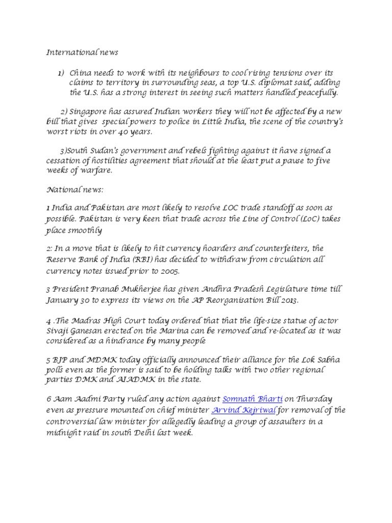 in surrounding seas, a top U.S. diplomat said, adding the U.S. has a strong interest in seeing such matters handled peacefully. 2) Singapore has assured Indian workers they will not be affected by a new bill that gives special powers to police in Little India, the scene of the countrys worst riots in over 40 years. 3)South Sudans government and rebels fighting against it have signed a cessation of hostilities agreement that should at the least put a pause to five weeks of warfare. National news: 1 India and Pakistan are most likely to resolve LOC trade standoff as soon as possible. Pakistan is very keen that trade across the Line of Control (LoC) takes place smoothly 2: In a move that is likely to hit currency hoarders and counterfeiters, the Reserve Bank of India (RBI) has decided to withdraw from circulation all currency notes issued prior to 2005. 3 President Pranab Mukherjee has given Andhra Pradesh Legislature time till January 30 to express its views on the AP Reorganisation Bill 2013. 4 .The Madras High Court today ordered that that the life-size statue of actor Sivaji Ganesan erected on the Marina can be removed and re-located as it was considered as a hindrance by many people 5 BJP and MDMK today officially announced their alliance for the Lok Sabha polls even as the former is said to be holding talks with two other regional parties DMK and AIADMK in the state. 6 Aam Aadmi Party ruled any action against Somnath Bharti on Thursday even as pressure mounted on chief minister Arvind Kejriwal for removal of the controversial law minister for allegedly leading a group of assaulters in a midnight raid in south Delhi last week.