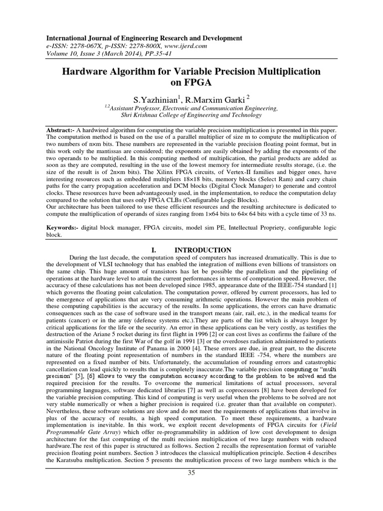 During the last decade, the computation speed of computers has increased dramatically. This is due to the development of VLSI technology that has enabled the integration of millions even billions of transistors on the same chip. This huge amount of transistors has let be possible the parallelism and the pipelining of operations at the hardware level to attain the current performances in terms of computation speed. However, the accuracy of these calculations has not been developed since 1985, appearance date of the IEEE-754 standard [1] which governs the floating point calculation. The computation power, offered by current processors, has led to the emergence of applications that are very consuming arithmetic operations. However the main problem of these computing capabilities is the accuracy of the results. In some applications, the errors can have dramatic consequences such as the case of software used in the transport means (air, rail, etc.), in the medical teams for patients (cancer) or in the army (defence systems etc.).They are parts of the list which is always longer by critical applications for the life or the security. An error in these applications can be very costly, as testifies the destruction of the Ariane 5 rocket during its first flight in 1996 [2] or can cost lives as confirms the failure of the antimissile Patriot during the first War of the golf in 1991 [3] or the overdoses radiation administered to patients in the National Oncology Institute of Panama in 2000 [4]. These errors are due, in great part, to the discrete nature of the floating point representation of numbers in the standard IEEE -754, where the numbers are represented on a fixed number of bits. Unfortunately, the accumulation of rounding errors and catastrophic cancellation can lead quickly to results that is completely [Link] variable precision computing or multi precision [5], [6] allows to vary the computation accuracy according to the problem to be solved and the required precision for the results. To overcome the numerical limitations of actual processors, several programming languages, software dedicated libraries [7] as well as coprocessors [8] have been developed for the variable precision computing. This kind of computing is very useful when the problems to be solved are not very stable numerically or when a higher precision is required (i.e. greater than that available on computer). Nevertheless, these software solutions are slow and do not meet the requirements of applications that involve in plus of the accuracy of results, a high speed computation. To meet these requirements, a hardware implementation is inevitable. In this work, we exploit recent developments of FPGA circuits for ( Field Programmable Gate Array) which offer re-programmability in addition of low cost development to design architecture for the fast computing of the multi recision multiplication of two large numbers with reduced [Link] rest of this paper is structured as follows. Section 2 recalls the representation format of variable precision floating point numbers. Section 3 introduces the classical multiplication principle. Section 4 describes the Karatsuba multiplication. Section 5 presents the multiplication process of two large numbers which is the