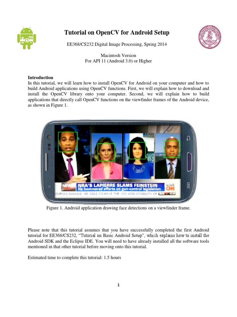 Please note that this tutorial assumes that you have successfully completed the first Android tutorial for EE368/CS232, Tutorial on Basic Android Setup, which explains how to install the Android SDK and the Eclipse IDE. You will need to have already installed all the software tools mentioned in that other tutorial before moving onto this tutorial. Estimated time to complete this tutorial: 1.5 hours
