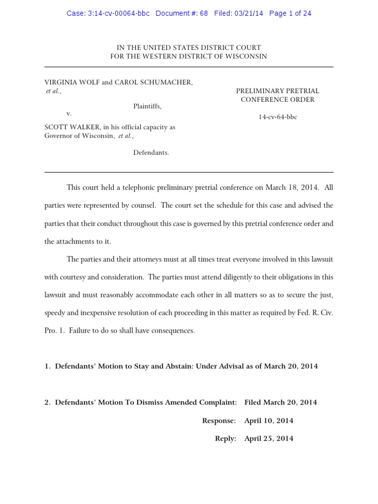 VIRGINIA WOLF and CAROL SCHUMACHER, et al., Plaintiffs, v. SCOTT WALKER, in his official capacity as Governor of Wisconsin, et al., Defendants.