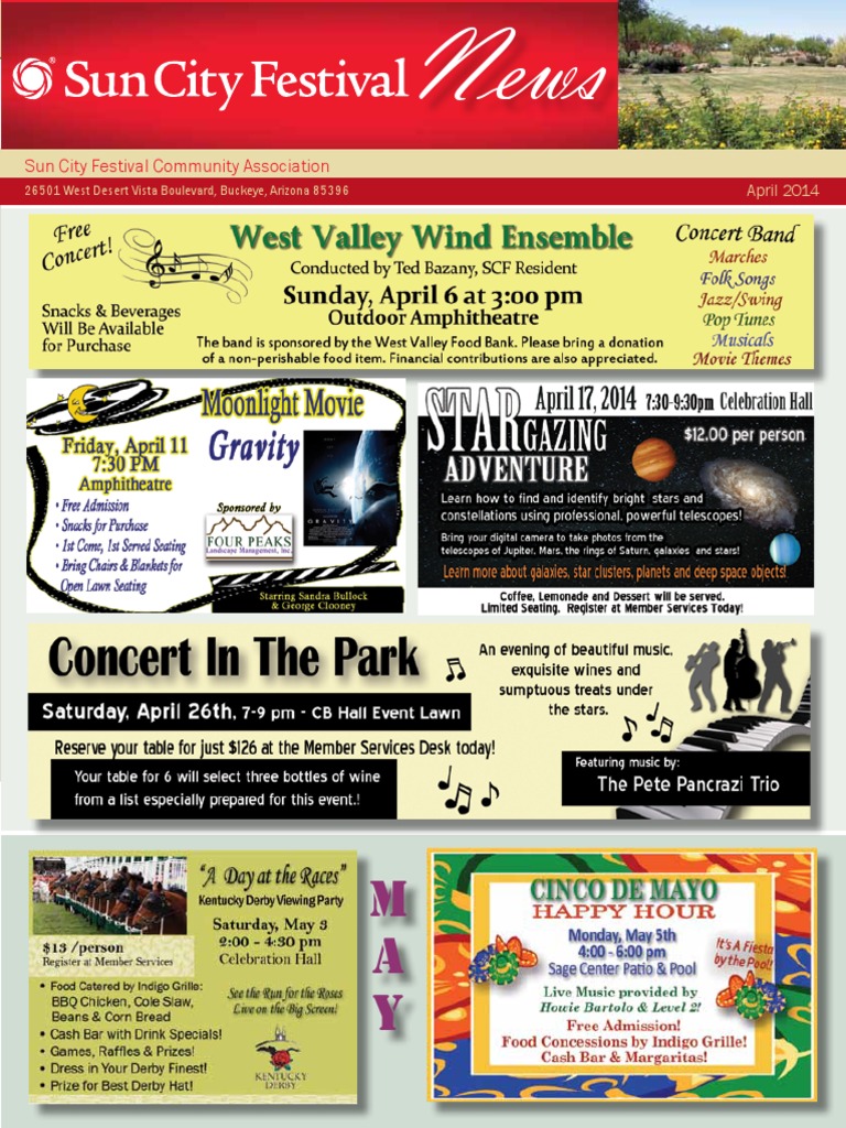 April 5 Murder Mystery Dinner, Murder in Margaritaland 6-10 pm Celebration Hall April 6 West Valley Wind Ensemble Concert Free Admission 3 pm Outdoor Amphitheatre April 7 AARP Driver Safety Program 12 Noon - 4 pm Celebration Hall West April 10 Buckeye Bookmobile 9 am - Noon Sage Center Parking Lot AXA Financial Seminar 10 am Sable Room Clear Solutions Seminar 3:30 pm Celebration Hall West April 11 Moonlight Movie, Gravity Free Admission 7:30 pm Amphitheatre April 14 Perils of Probate - Edward Jones Seminar 10 am Sable Room