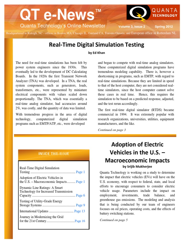 The Quanta Technologys e-NEWS Newsletter is published quarterly at the offices of Quanta Technology, 4020 Westchase Blvd, Suite 300, Raleigh, NC. Any reproduction or use of content, without attribution, is forbidden.