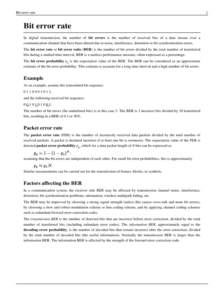 Bit error rate Source: http://en.wikipedia.org/w/index.php?oldid=599433034 Contributors: Acalamari, AndyHe829, Beabroad, Bellhead, Bobblewik, Darkwind, DavidCary, Eastlaw, Edward, ErRied, Fuzzy Logic, F, Giftlite, Gilliam, Giraffedata, Glenn, Glloq, Gqqnb, Grubber, Hooperbloob, I dream of horses, JamesThomasCurran, Jeffewers, Jim.henderson, JlewisAustin, Kevin Rector, Kvng, MER-C, Mange01, Migor.s, Mike Rosoft, Nageh, Net, Noted trip3, Oli Filth, Ozrepublic, Pcb21, R'n'B, Rebroad, Renata3, Rich Farmbrough, Schmiteye, SchuminWeb, Strait, The Anome, Tolmantl, Twice25, 83 anonymous edits