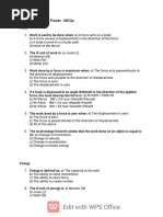 13. Ideal Effort can be expressed by (a) Pi =2W/VR (b) Pi =W/VR (c) Pi =W2/VR (d) Pi =0.5W/VR Ans: b 14. In an ideal machine, (a) Output of a machine > Input of a machine (b) Output of a machine =0.5 X Input of a machine (c) Output of a machine < Input of a machine (d) Output of a machine = Input of a machine Ans: d 15. In practice, why it is difficult to get an ideal machine? (a) Work done is utilised to overcome frictional resistance. (b) Useful work done in lifting the load is reduced. (c) It occurs the reduction of efficiency. (d) All these reasons are valid. Ans: d 16. The law of machine can be expressed mathematically in the form of (a) Parabola (b) Circle (c) Straight line (d) Any of these Ans: c