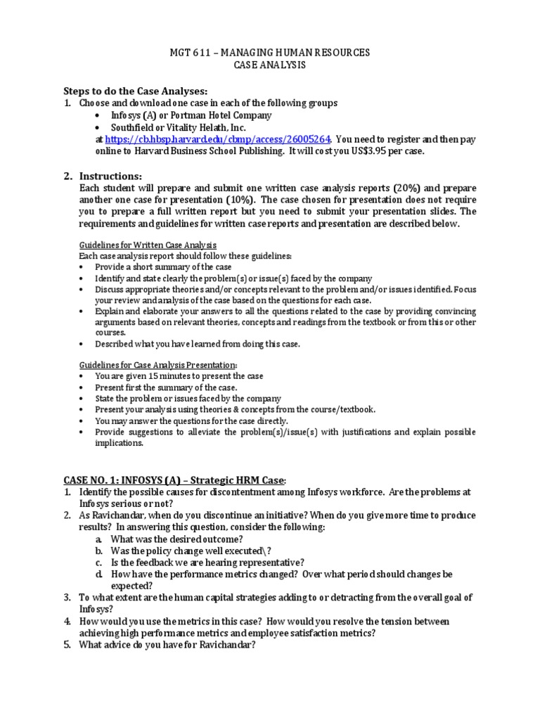 1. Choose and download one case in each of the following groups Infosys (A) or Portman Hotel Company Southfield or Vitality Helath, Inc. at https://cb.hbsp.harvard.edu/cbmp/access/26005264. You need to register and then pay online to Harvard Business School Publishing. It will cost you US$3.95 per case.
