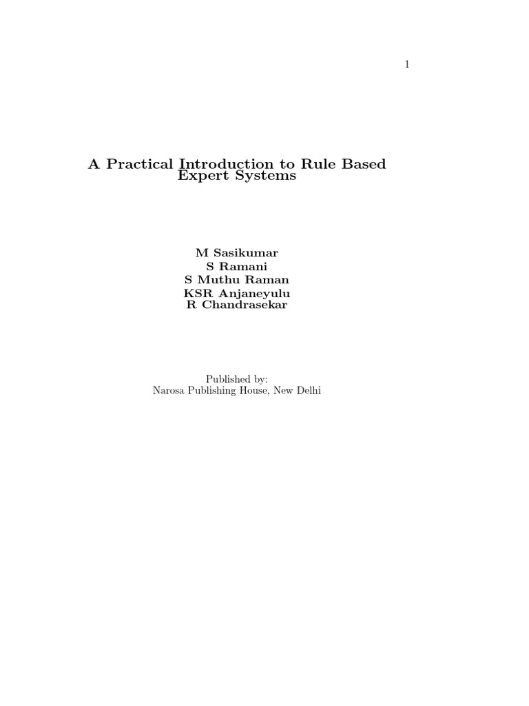 Have you read a book from beginning to end and then realized that none of the ideas in the book can be directly used in the real world? This may be acceptable in some elds, but not in the area of expert systems, which is inherently practical. You cannot really understand what expert systems are unless you have implemented one. In writing this book we have tried to ensure that readers get practical knowledge, which will help them not only to understand expert systems technology, but also to implement expert systems. We have been teaching courses on expert systems for many years. We have evaluated many books for use with these courses. We found that most books currently available do not provide a satisfactory introduction to expert systems. Books we looked at were either too full of detail, or too abstract. Basic concepts were completely left out in some books. There are some basic ideas in expert systems which one should understand before implementing expert systems. However, these ideas should only be the stepping stones to the practical aspects of expert systems technology. Keeping this in mind, we have tried to provide a judicious mixture of principles and practical aspects in this book. The book is structured around a part-time course on expert systems which is conducted at the National Centre for Software Technology (NCST). The emphasis in that course, and in this book, is on rule based expert systems. However, aspects related to other types of expert systems have also been covered. Chapters 1 to 6 deal with a variety of issues related to the principles of expert systems. Chapter 7 describes some rule based expert systems in use. Chapter 8 provides advice on knowledge engineering, and Chapter 9 on the verication and validation of rule based expert systems. Chapter 10 deals with some other topics of interest in the area of expert systems. Chapters 11 to 13 are case studies which illustrate techniques which can be used in developing rule based expert systems. Complete rule bases for these case studies are listed in the appendices. The expert systems background required for the case studies is covered in the rst eight chapters. Every chapter has a summary, which lists the key ideas discussed in that chapter. There are exercises at the end of most chapters. Answers to selected exercises are given in an appendix. There are a few sections in the book which may be omitted during the rst v