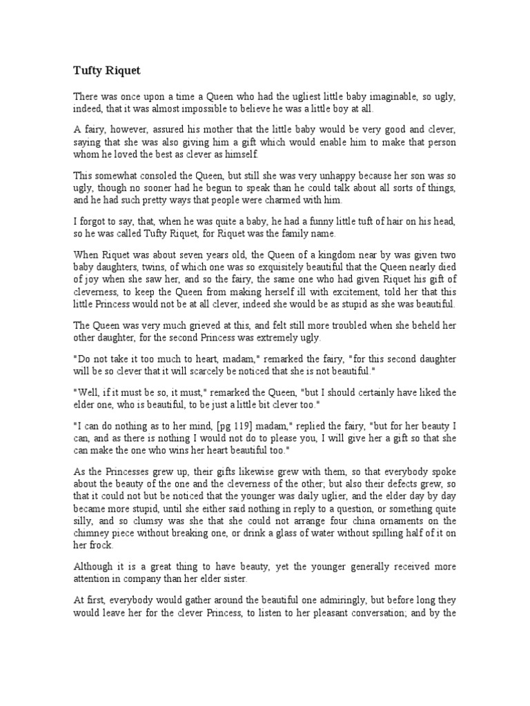 There was once upon a time a Queen who had the ugliest little baby imaginable, so ugly, indeed, that it was almost impossible to believe he was a little boy at all. A fairy, however, assured his mother that the little baby would be very good and clever, saying that she was also giving him a gift which would enable him to make that person whom he loved the best as clever as himself. This somewhat consoled the Queen, but still she was very unhappy because her son was so ugly, though no sooner had he begun to speak than he could talk about all sorts of things, and he had such pretty ways that people were charmed with him. I forgot to say, that, when he was quite a baby, he had a funny little tuft of hair on his head, so he was called Tufty Riquet, for Riquet was the family name. When Riquet was about seven years old, the Queen of a kingdom near by was given two baby daughters, twins, of which one was so exquisitely beautiful that the Queen nearly died of joy when she saw her, and so the fairy, the same one who had given Riquet his gift of cleverness, to keep the Queen from making herself ill with excitement, told her that this little Princess would not be at all clever, indeed she would be as stupid as she was beautiful. The Queen was very much grieved at this, and felt still more troubled when she beheld her other daughter, for the second Princess was extremely ugly. "Do not take it too much to heart, madam," remarked the fairy, "for this second daughter will be so clever that it will scarcely be noticed that she is not beautiful." "Well, if it must be so, it must," remarked the Queen, "but I should certainly have liked the elder one, who is beautiful, to be just a little bit clever too." "I can do nothing as to her mind, [pg 119] madam," replied the fairy, "but for her beauty I can, and as there is nothing I would not do to please you, I will give her a gift so that she can make the one who wins her heart beautiful too." As the Princesses grew up, their gifts likewise grew with them, so that everybody spoke about the beauty of the one and the cleverness of the other; but also their defects grew, so that it could not but be noticed that the younger was daily uglier, and the elder day by day became more stupid, until she either said nothing in reply to a question, or something quite silly, and so clumsy was she that she could not arrange four china ornaments on the chimney piece without breaking one, or drink a glass of water without spilling half of it on her frock. Although it is a great thing to have beauty, yet the younger generally received more attention in company than her elder sister. At first, everybody would gather around the beautiful one admiringly, but before long they would leave her for the clever Princess, to listen to her pleasant conversation; and by the