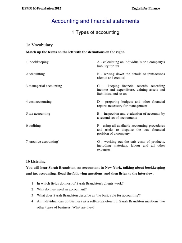 1b Listening You will hear Sarah Brandston, an accountant in New York, talking about bookkeeping and tax accounting. Read the following questions, and then listen to the interview. 1 2 3 4 In which fields do most of Sarah Brandston's clients work? Why do they need an accountant? What does Sarah Brandston describe as 'the basic rule for accounting'? An individual can do business as a self-proprietorship. Sarah Brandston mentions two other types of business. What are they?