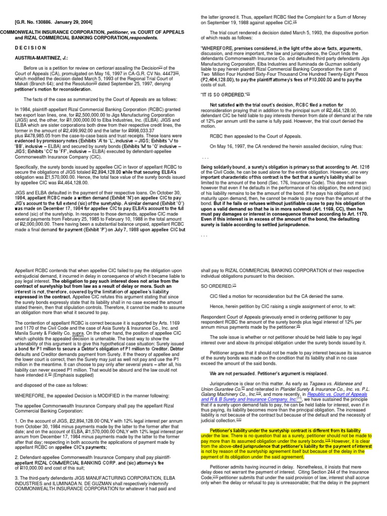 COURT OF APPEALS and RIZAL COMMERCIAL BANKING CORPORATION,respondents. DECISION AUSTRIA-MARTINEZ, J.: Before us is a petition for review on certiorari assailing the Decision[1] of the Court of Appeals (CA), promulgated on May 16, 1997 in CA-G.R. CV No. 44473[2], which modified the decision dated March 5, 1993 of the Regional Trial Court of Makati (Branch 64); and the Resolution[3] dated September 25, 1997, denying petitioners motion for reconsideration. The facts of the case as summarized by the Court of Appeals are as follows: In 1984, plaintiff-appellant Rizal Commercial Banking Corporation (RCBC) granted two export loan lines, one, for P2,500,000.00 to Jigs Manufacturing Corporation (JIGS) and, the other, for P1,000,000.00 to Elba Industries, Inc. (ELBA). JIGS and ELBA which are sister corporations both drew from their respective credit lines, the former in the amount of P2,499,992.00 and the latter for P998,033.37 plus P478,985.05 from the case-to-case basis and trust receipts. These loans were evidenced by promissory notes (Exhibits A to L, inclusive JIGS; Exhibits V to BB, inclusive ELBA) and secured by surety bonds (Exhibits M to Q inclusive JIGS; Exhibits CC to FF, inclusive ELBA) executed by defendant-appellee Commonwealth Insurance Company (CIC). Specifically, the surety bonds issued by appellee CIC in favor of appellant RCBC to secure the obligations of JIGS totaled P2,894,128.00 while that securing ELBAs obligation was P1,570,000.00. Hence, the total face value of the surety bonds issued by appellee CIC was P4,464,128.00. JIGS and ELBA defaulted in the payment of their respective loans. On October 30, 1984, appellant RCBC made a written demand (Exhibit N) on appellee CIC to pay JIGs account to the full extend (sic) of the suretyship. A similar demand (Exhibit O) was made on December 17, 1984 for appellee CIC to pay ELBAs account to the full extend (sic) of the suretyship. In response to those demands, appellee CIC made several payments from February 25, 1985 to February 10, 1988 in the total amount of P2,000,000.00. There having been a substantial balance unpaid, appellant RCBC made a final demand for payment (Exhibit P) on July 7, 1988 upon appellee CIC but