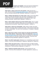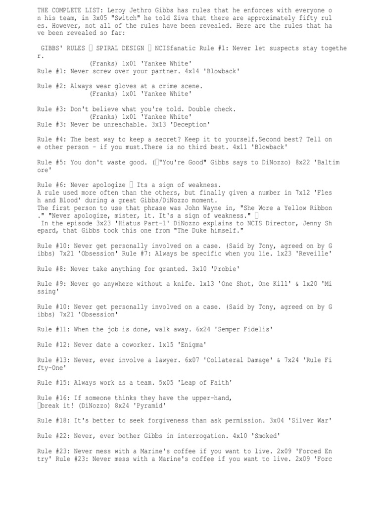 (Franks) 1x01 'Yankee White' Rule #1: Never screw over your partner. 4x14 'Blowback' Rule #2: Always wear gloves at a crime scene. (Franks) 1x01 'Yankee White' Rule #3: Don't believe what you're told. Double check. (Franks) 1x01 'Yankee White' Rule #3: Never be unreachable. 3x13 'Deception' Rule #4: The best way to keep a secret? Keep it to [Link] best? Tell on e other person - if you [Link] is no third best. 4x11 'Blowback' Rule #5: You don't waste good. ( "You're Good" Gibbs says to DiNozzo) 8x22 'Baltim ore' Rule #6: Never apologize Its a sign of weakness. A rule used more often than the others, but finally given a number in 7x12 'Fles h and Blood' during a great Gibbs/DiNozzo moment. The first person to use that phrase was John Wayne in, "She Wore a Yellow Ribbon ." "Never apologize, mister, it. It's a sign of weakness." In the episode 3x23 'Hiatus Part-1' DiNozzo explains to NCIS Director, Jenny Sh epard, that Gibbs took this one from "The Duke himself." Rule #10: Never get personally involved on a case. (Said by Tony, agreed on by G ibbs) 7x21 'Obsession' Rule #7: Always be specific when you lie. 1x23 'Reveille' Rule #8: Never take anything for granted. 3x10 'Probie' Rule #9: Never go anywhere without a knife. 1x13 'One Shot, One Kill' & 1x20 'Mi ssing' Rule #10: Never get personally involved on a case. (Said by Tony, agreed on by G ibbs) 7x21 'Obsession' Rule #11: When the job is done, walk away. 6x24 'Semper Fidelis' Rule #12: Never date a coworker. 1x15 'Enigma' Rule #13: Never, ever involve a lawyer. 6x07 'Collateral Damage' & 7x24 'Rule Fi fty-One' Rule #15: Always work as a team. 5x05 'Leap of Faith' Rule #16: If someone thinks they have the upper-hand, break it! (DiNozzo) 8x24 'Pyramid' Rule #18: It's better to seek forgiveness than ask permission. 3x04 'Silver War' Rule #22: Never, ever bother Gibbs in interrogation. 4x10 'Smoked' Rule #23: Never mess with a Marine's coffee if you want to live. 2x09 'Forced En try' Rule #23: Never mess with a Marine's coffee if you want to live. 2x09 'Forc
