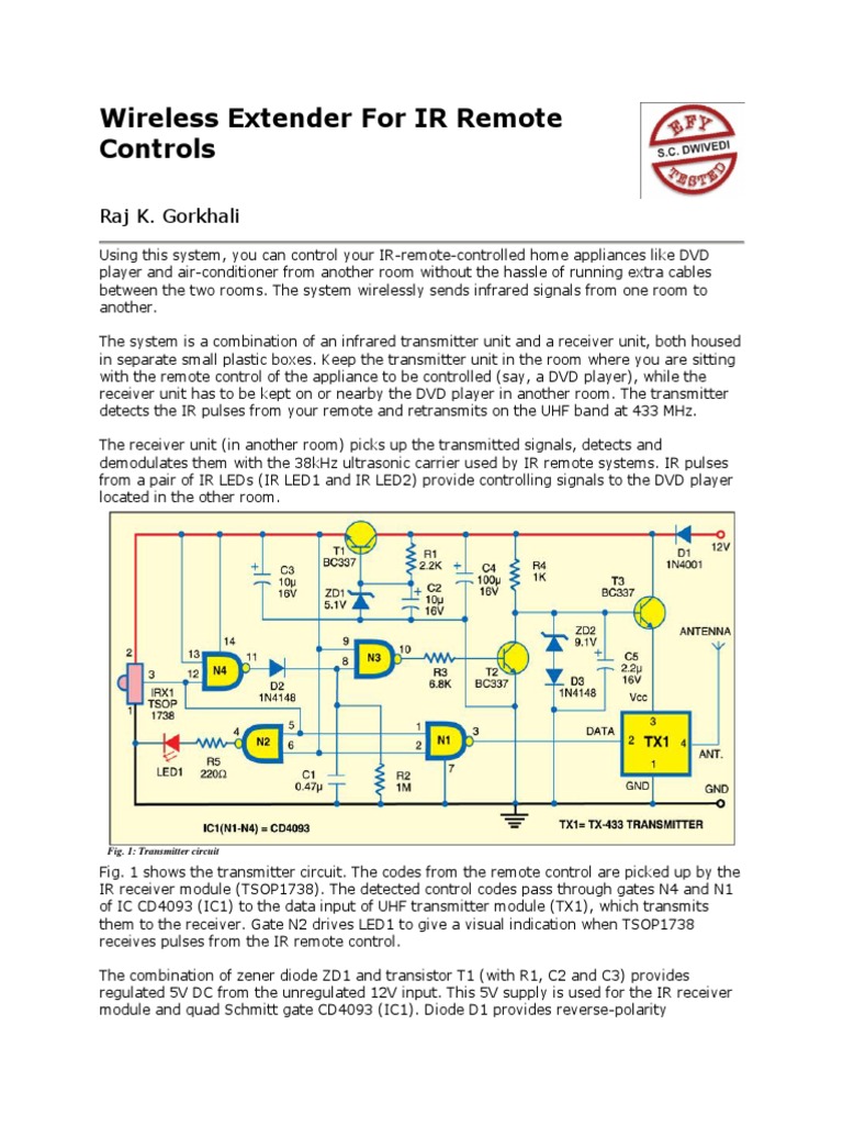 Using this system, you can control your IR-remote-controlled home appliances like DVD player and air-conditioner from another room without the hassle of running extra cables between the two rooms. The system wirelessly sends infrared signals from one room to another. The system is a combination of an infrared transmitter unit and a receiver unit, both housed in separate small plastic boxes. Keep the transmitter unit in the room where you are sitting with the remote control of the appliance to be controlled (say, a DVD player), while the receiver unit has to be kept on or nearby the DVD player in another room. The transmitter detects the IR pulses from your remote and retransmits on the UHF band at 433 MHz. The receiver unit (in another room) picks up the transmitted signals, detects and demodulates them with the 38kHz ultrasonic carrier used by IR remote systems. IR pulses from a pair of IR LEDs (IR LED1 and IR LED2) provide controlling signals to the DVD player located in the other room.