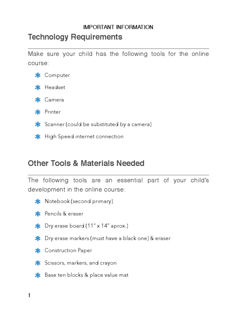 Make sure your child has the following tools for the online course: