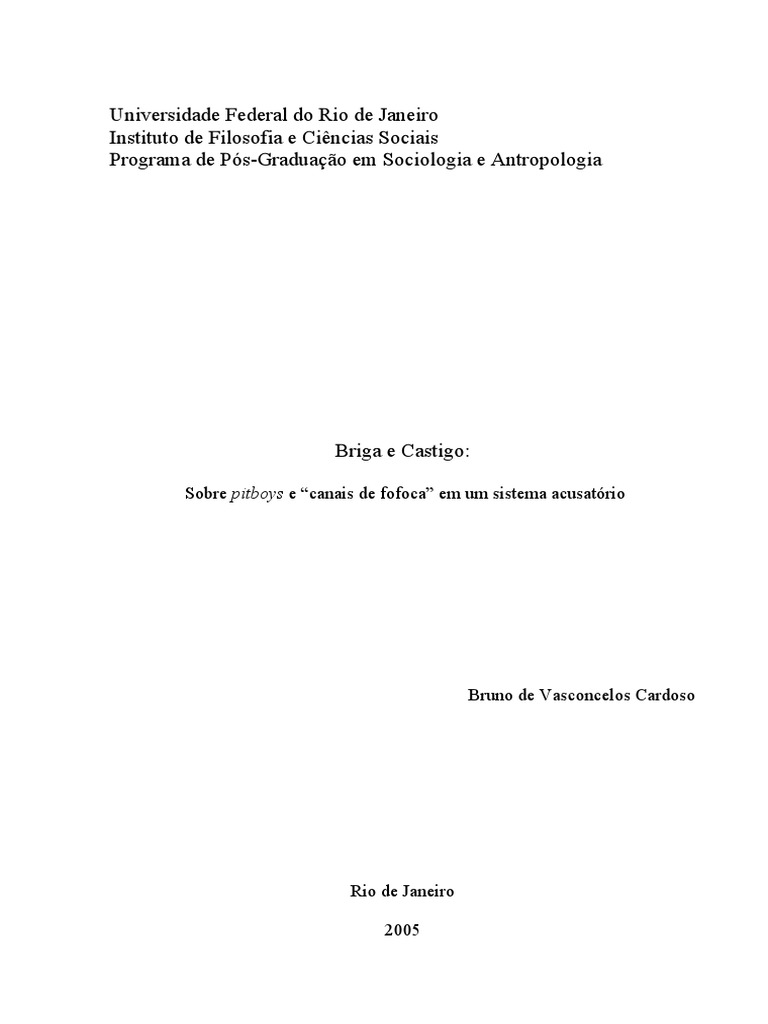 Esta dissertao analisa o que se convencionou chamar de ataques de pitboys, ou seja, manifestaes de violncia por parte de jovens de classe mdia (entre 18 e 24 anos, todos do sexo masculino) em situaes classificadas como de lazer. Para isso so realizados trs estudos de caso, buscando, por meio de um drama social, melhor apreender quais valores so exaltados e quais so censurados por aqueles que se pronunciam sobre o assunto, atravs dos dirios O Globo e Jornal do Brasil (que seriam representativos de um estrato mdio superior carioca). A metodologia do trabalho consiste em uma anlise minuciosa do material jornalstico sobre os casos, sendo esses dois jornais tratados como importantes e vultuosos canais de fofoca em um contexto de sociedades complexas, se revelando muito til para captar os discursos das trs partes envolvidas no processo de rotulao (etapa avanada do ato desviante): os acusados, os acusadores e os defensores. Depreende-se ento que a exigncia generalizada de que os pitboys fossem imediatamente punidos faz com que ocorra, nos trs casos, uma mudana de tipificao criminal na qual os jovens so enquadrados. Tal mudana ocorre sempre em direo a um delito que proporcione a deteno imediata dos acusados, no tendo importncia se ocorre de modo arbitrrio ou no. A aparente contradio entre a condenao de um comportamento que no segue o princpio individualista da mediao estatal na resoluo de conflitos, e a aprovao da adoo de medidas punitivas excessivamente rigorosas, com o fim no de cumprir a lei, mas de servir como exemplo da intolerncia contra esse tipo de delito, no se faz sentir em momento nenhum no debate popular. Isto revela como se d de maneira fluida e contnua o trnsito entre diferentes cdigos culturais, permanentemente combinados, confrontados e reconstrudos, desenvolvendo um modus operandi caracterstico do brasileiro urbano.