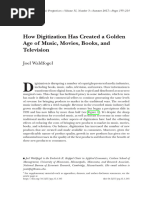 [21] Peitz, M., and P. Waelbroeck (2004). The Eect of Internet Piracy on CD Sales: CrossSection Evidence, Review of Economic Research on Copyright Issues 1(2): 7179. [22] , and (2006). Why the Music Industry May Gain from Free Downloading, International Journal of Industrial Organization 24(5): 907913. [23] Peters, M. (2007). Statement of Marybeth Peters, the Register of Copyrights, before the Subcommittee on Courts, the Internet, and Intellectual Property, Committee on the Judiciary, United States House of Representatives. [24] Rob, R., and J. Waldfogel (2006). Piracy on the High Cs: Music Downloading, Sales Displacement, and Social Welfare in a Sample of College Students, Journal of Law and Economics 49(1): 2962. [25] Waldfogel, J. (2010). Music File Sharing and Sales Displacement in the iTunes Era, Information Economics and Policy 22(4): 306314. [26] (2012). And the Bands Played On: Digital Disintermediation and the Quality of New Recorded Music, Mimeo. [27] Zentner, A. (2006). Measuring the Eect of File Sharing on Music Purchases, Journal of Law and Economics 49(1): 6390. [28] (2010). Ten Years of File Sharing and Its Eect on International Physical and Digital Music Sales, Mimeo.