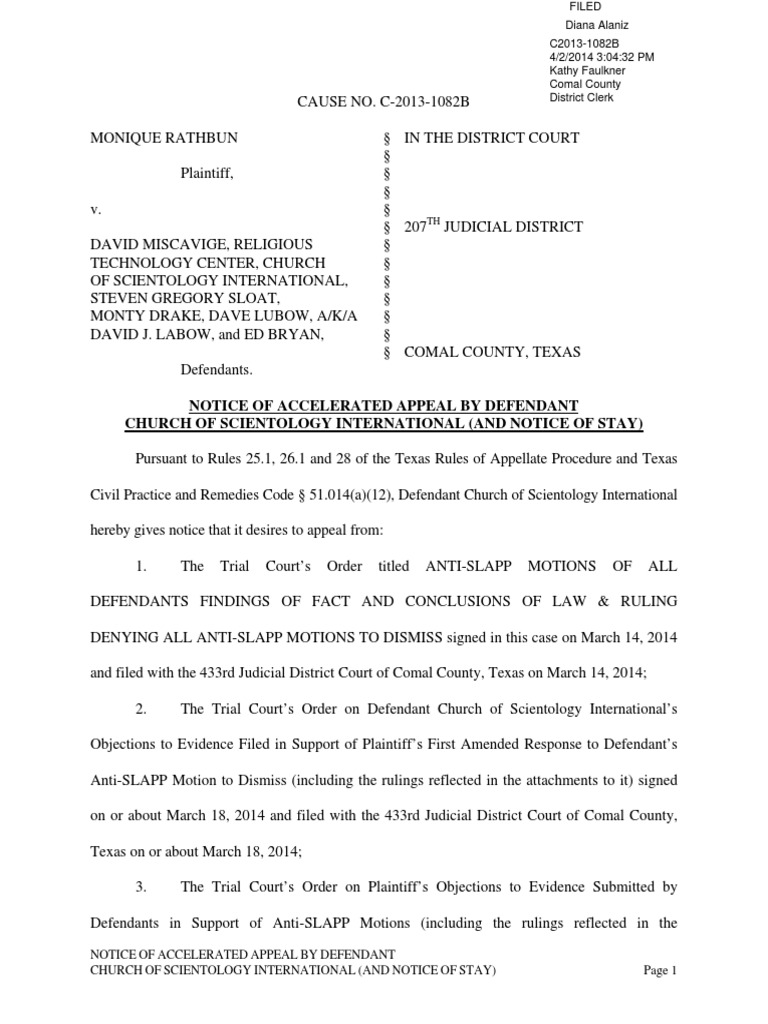 Pursuant to Rules 25.1, 26.1 and 28 of the Texas Rules of Appellate Procedure and Texas Civil Practice and Remedies Code § 51.014(a)(12), Defendant Church of Scientology International hereby gives notice that it desires to appeal from: 1. The Trial Court’s Order titled ANTI-SLAPP MOTIONS OF ALL DEFENDANTS FINDINGS OF FACT AND CONCLUSIONS OF LAW & RULING DENYING ALL ANTI-SLAPP MOTIONS TO DISMISS signed in this case on March 14, 2014 and filed with the 433rd Judicial District Court of Comal County, Texas on March 14, 2014; 2. The Trial Court’s Order on Defendant Church of Scientology International’s Objections to Evidence Filed in Support of Plaintiff’s First Amended Response to Defendant’s Anti-SLAPP Motion to Dismiss (including the rulings reflected in the attachments to it) signed on or about March 18, 2014 and filed with the 433rd Judicial District Court of Comal County, Texas on or about March 18, 2014; 3. The Trial Court’s Order on Plaintiff’s Objections to Evidence Submitted by Defendants in Support of Anti-SLAPP Motions (including the rulings reflected in the