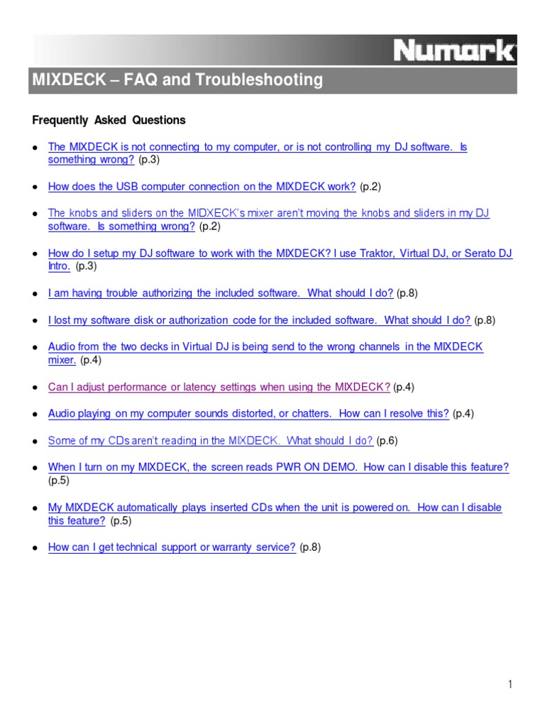 The MIXDECK is not connecting to my computer, or is not controlling my DJ software. Is something wrong? (p.3) How does the USB computer connection on the MIXDECK work? (p.2) The knobs and sliders on the MIDXECKs mixer arent moving the knobs and sliders in my DJ software. Is something wrong? (p.2) How do I setup my DJ software to work with the MIXDECK? I use Traktor, Virtual DJ, or Serato DJ Intro. (p.3) I am having trouble authorizing the included software. What should I do? (p.8) I lost my software disk or authorization code for the included software. What should I do? (p.8) Audio from the two decks in Virtual DJ is being send to the wrong channels in the MIXDECK mixer. (p.4) Can I adjust performance or latency settings when using the MIXDECK? (p.4) Audio playing on my computer sounds distorted, or chatters. How can I resolve this? (p.4) Some of my CDs arent reading in the MIXDECK. What should I do? (p.6) When I turn on my MIXDECK, the screen reads PWR ON DEMO. How can I disable this feature? (p.5) My MIXDECK automatically plays inserted CDs when the unit is powered on. How can I disable this feature? (p.5) How can I get technical support or warranty service? (p.8)
