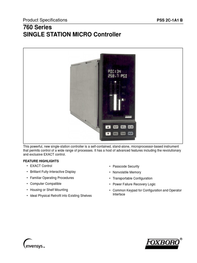 PSS 2C-1A1 B Page 2 EXACT CONTROL The EXACT tuning method does not use an arbitrary process model. Instead it uses micro-processor technology to make controller adjustments based on the actual, current process dynamics. Thus, while continuously scanning the process variables, if it senses a process upset, it immediately takes corrective action. The user can choose the degree of response by specifying the desired damping and overshoot-to-load change, such as quarter-amplitude damping. This new, exciting tool is on the job 24 hours a day, and it can be turned on or off from the keypad. Process upsets do occur, but with EXACT control, the product need not suffer. CHOICE OF HOUSING OR SHELF MOUNTING The 760CNA has an integral housing that can be mounted directly to a panel. The 760CSA can be installed in most Foxboro shelves with only little additional hardware. The controller is a physical substitute for H-Line, E27 Series, and even pneumatic 100-Line controllers. SIMPLIFIED CONFIGURATION AND OPERATION Because of the controllers flexibility, it can be easily configured to meet the most exacting process requirements. All operating functions can be examined and/or changed by pushbutton. Interactive prompting simplifies setting of adjustable functions. From the operators standpoint there is very little new to learn. The same familiar control concepts and terminology are used. What is new is the ease with which the various controller operations can be implemented or changed, and the ease with which complete information about the process and the controller is made available, literally at the push of a button. COPY FEATURE The copy feature permits the controller configura-tion to be duplicated for use in another controller. This is accomplished by using two NOVRAMS (nonvolatile, random access memory modules) and a configuration copy accessory. Briefly, after turning off power, the procedure is as follows. First remove the first NOVRAM (in controller and already configured); then install (plug in) the copy accessory; next plug the first NOVRAM and second NOVRAM (memory to be configured) into the copy accessory; and then turn on the power and the second NOVRAM is now copied for use in another controller. With minimum effort, any number of controllers can thus be configured to the same parameters as the original controller. Each controller, as configured, can then have any of its individual parameters changed to any desired value. READY FOR COMPUTER TIE-IN The controller is equipped with an RS485 serial port to connect to certain personal computers through an RS232C-RS485 converter. This simple converter provides the proper electrical and mechanical interface between these serial communication standards. COMPLETE SECURITY FOR PROCESS SETTINGS The operator has keypad access to read the value of inputs, alarm and limit settings, as well as the operating configuration. However, the operator can adjust only those settings which were specified as operator-changeable when the controller was configured. The remaining parameters can only be accessed for change by first entering a passcode from the keypad. This passcode is chosen by an authorized person at the time the controller is configured. Thus, only those who have been given this passcode can change any of the configuration parameters, including the passcode.