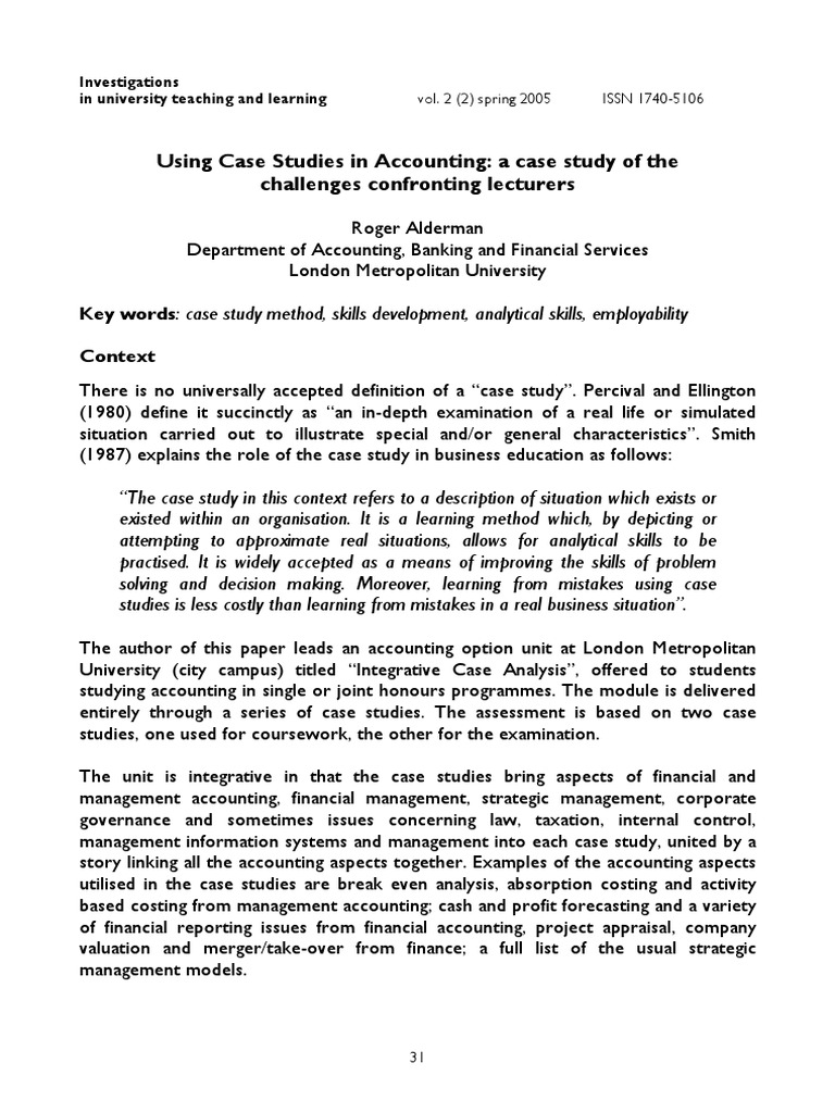 Roger Alderman Department of Accounting, Banking and Financial Services London Metropolitan University Key words: case study method, skills development, analytical skills, employability Context There is no universally accepted definition of a case study. Percival and Ellington (1980) define it succinctly as an in-depth examination of a real life or simulated situation carried out to illustrate special and/or general characteristics. Smith (1987) explains the role of the case study in business education as follows: The case study in this context refers to a description of situation which exists or existed within an organisation. It is a learning method which, by depicting or attempting to approximate real situations, allows for analytical skills to be practised. It is widely accepted as a means of improving the skills of problem solving and decision making. Moreover, learning from mistakes using case studies is less costly than learning from mistakes in a real business situation. The author of this paper leads an accounting option unit at London Metropolitan University (city campus) titled Integrative Case Analysis, offered to students studying accounting in single or joint honours programmes. The module is delivered entirely through a series of case studies. The assessment is based on two case studies, one used for coursework, the other for the examination. The unit is integrative in that the case studies bring aspects of financial and management accounting, financial management, strategic management, corporate governance and sometimes issues concerning law, taxation, internal control, management information systems and management into each case study, united by a story linking all the accounting aspects together. Examples of the accounting aspects utilised in the case studies are break even analysis, absorption costing and activity based costing from management accounting; cash and profit forecasting and a variety of financial reporting issues from financial accounting, project appraisal, company valuation and merger/take-over from finance; a full list of the usual strategic management models.