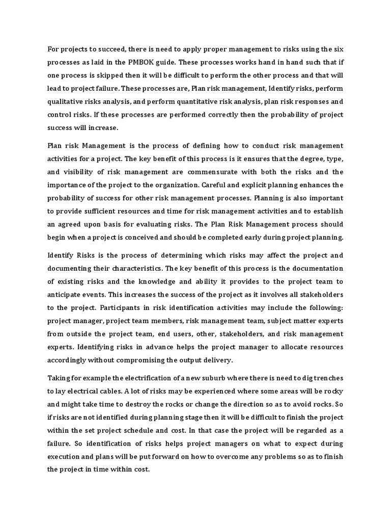 PMBOK guide. These processes works hand in hand such that if one process is skipped then it will be difficult to perform the other process and that will lead to project failure. These processes are, Plan risk management, Identify risks, perform qualitative risks analysis, and perform quantitative risk analysis, plan risk responses and control risks. If these processes are performed correctly then the probability of project success will increase. Plan risk Management is the process of defining how to conduct risk management activities for a project. The key benefit of this process is it ensures that the degree, type, and visibility of risk management are commensurate with both the risks and the importance of the project to the organization. Careful and explicit planning enhances the probability of success for other risk management processes. Planning is also important to provide sufficient resources and time for risk management activities and to establish an agreed upon basis for evaluating risks. The Plan Risk Management process should begin when a project is conceived and should be completed early during project planning. Identify Risks is the process of determining which risks may affect the project and documenting their characteristics. The key benefit of this process is the documentation of existing risks and the knowledge and ability it provides to the project team to anticipate events. This increases the success of the project as it involves all stakeholders to the project. Participants in risk identification activities may include the following: project manager, project team members, risk management team, subject matter experts from outside the project team, end users, other, stakeholders, and risk management experts. Identifying risks in advance helps the project manager to allocate resources accordingly without compromising the output delivery. Taking for example the electrification of a new suburb where there is need to dig trenches to lay electrical cables. A lot of risks may be experienced where some areas will be rocky and might take time to destroy the rocks or change the direction so as to avoid rocks. So if risks are not identified during planning stage then it will be difficult to finish the project within the set project schedule and cost. In that case the project will be regarded as a failure. So identification of risks helps project managers on what to expect during execution and plans will be put forward on how to overcome any problems so as to finish the project in time within cost.