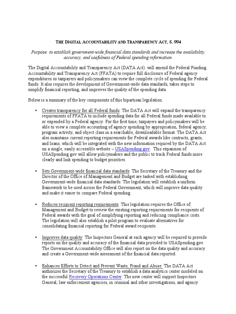 994 Purpose: to establish government-wide financial data standards and increase the availability, accuracy, and usefulness of Federal spending information. The Digital Accountability and Transparency Act (DATA Act) will amend the Federal Funding Accountability and Transparency Act (FFATA) to require full disclosure of Federal agency expenditures so taxpayers and policymakers can view the complete cycle of spending for Federal funds. It also requires the development of Government-wide data standards, takes steps to simplify financial reporting, and improves the quality of the spending data. Below is a summary of the key components of this bipartisan legislation. Creates transparency for all Federal funds: The DATA Act will expand the transparency requirements of FFATA to include spending data for all Federal funds made available to or expended by a Federal agency. For the first time, taxpayers and policymakers will be able to view a complete accounting of agency spending by appropriation, federal agency, program activity, and object class in a searchable, downloadable format. The DATA Act also maintains current reporting requirements for Federal awards like contracts, grants, and loans, which will be integrated with the new information required by the DATA Act on a single, easily accessible website USASpending.gov. This expansion of USASpending.gov will allow policymakers and the public to track Federal funds more clearly and link spending to budget priorities. Sets Government-wide financial data standards: The Secretary of the Treasury and the Director of the Office of Management and Budget are tasked with establishing Government-wide financial data standards. The legislation will establish a uniform framework to be used across the Federal Government, which will improve data quality and make it easier to compare Federal spending. Reduces recipient reporting requirements: This legislation requires the Office of Management and Budget to review the existing reporting requirements for recipients of Federal awards with the goal of simplifying reporting and reducing compliance costs. The legislation will also establish a pilot program to evaluate alternatives for consolidating financial reporting for Federal award recipients. Improves data quality: The Inspectors General at each agency will be required to provide reports on the quality and accuracy of the financial data provided to USASpending.gov. The Government Accountability Office will also report on the data quality and accuracy and create a Government-wide assessment of the financial data reported. Enhances Efforts to Detect and Prevent Waste, Fraud and Abuse: The DATA Act authorizes the Secretary of the Treasury to establish a data analytics center modeled on the successful Recovery Operations Center. The new center will support Inspectors General, law enforcement agencies, in criminal and other investigations, and agency