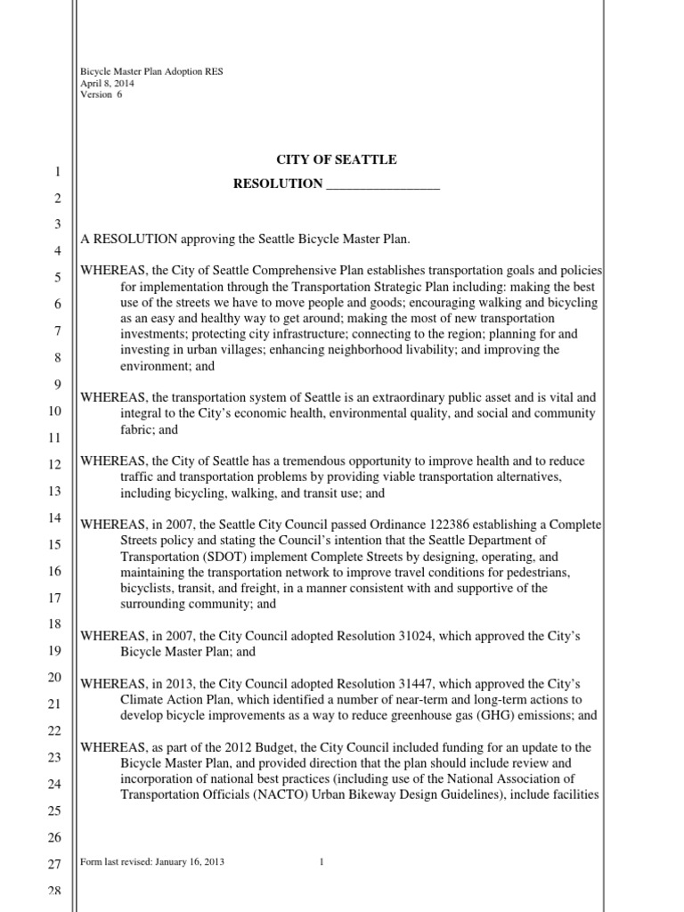A RESOLUTION approving the Seattle Bicycle Master Plan. WHEREAS, the City of Seattle Comprehensive Plan establishes transportation goals and policies for implementation through the Transportation Strategic Plan including: making the best use of the streets we have to move people and goods; encouraging walking and bicycling as an easy and healthy way to get around; making the most of new transportation investments; protecting city infrastructure; connecting to the region; planning for and investing in urban villages; enhancing neighborhood livability; and improving the environment; and WHEREAS, the transportation system of Seattle is an extraordinary public asset and is vital and integral to the City’s economic health, environmental quality, and social and community fabric; and WHEREAS, the City of Seattle has a tremendous opportunity to improve health and to reduce traffic and transportation problems by providing viable transportation alternatives, including bicycling, walking, and transit use; and WHEREAS, in 2007, the Seattle City Council passed Ordinance 122386 establishing a Complete Streets policy and stating the Council’s intention that the Seattle Department of Transportation (SDOT) implement Complete Streets by designing, operating, and maintaining the transportation network to improve travel conditions for pedestrians, bicyclists, transit, and freight, in a manner consistent with and supportive of the surrounding community; and WHEREAS, in 2007, the City Council adopted Resolution 31024, which approved the City’s Bicycle Master Plan; and WHEREAS, in 2013, the City Council adopted Resolution 31447, which approved the City’s Climate Action Plan, which identified a number of near-term and long-term actions to develop bicycle improvements as a way to reduce greenhouse gas (GHG) emissions; and WHEREAS, as part of the 2012 Budget, the City Council included funding for an update to the Bicycle Master Plan, and provided direction that the plan should include review and incorporation of national best practices (including use of the National Association of Transportation Officials (NACTO) Urban Bikeway Design Guidelines), include facilities