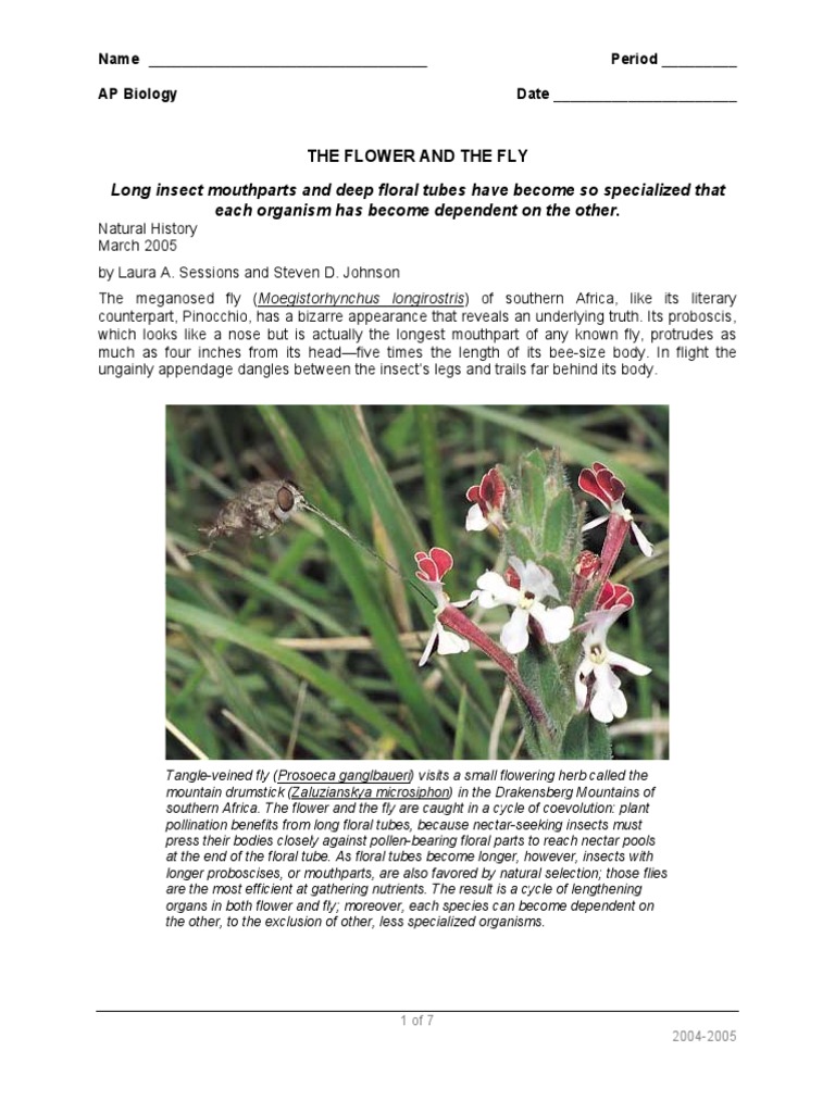 THE FLOWER AND THE FLY Long insect mouthparts and deep floral tubes have become so specialized that each organism has become dependent on the other.