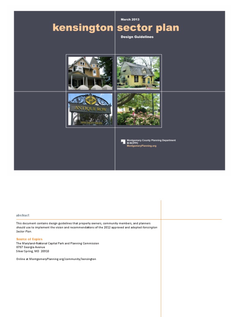 abstract This document contains design guidelines that property owners, community members, and planners should use to implement the vision and recommendations of the 2012 approved and adopted Kensington Sector Plan. Source of Copies The Maryland-National Capital Park and Planning Commission 8787 Georgia Avenue Silver Spring, MD 20910 Online at [Link]/community/kensington