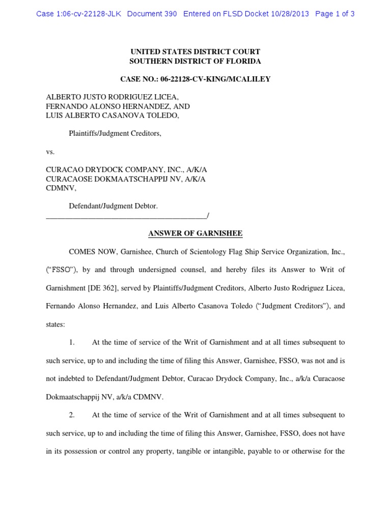 s expended to respond to the writ. WHEREFORE Garnishee, Church of Scientology Flagship Service Organization, Inc., requests that this Honorable Court enter an Order vacating Plaintiffs/Judgment Creditors, Alberto Justo Rodriguez Licea, Fernando Alonso Hernandez, and Luis Alberto Casanova Toledo
