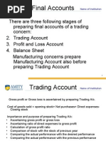 TRADING ACCOUNT IN CASE OF MANUFACTURING CONCERN Dr PARTICULARS To Opening Stock Of Finished Goods To Manufacturing Account AMOU AMOU NT NT PARTICULARS By Sales . .. Less: Sales return By Closing Stock Of Finished Goods To Gross profit c/d (If credit side exceed debit side) Total By Gross Loss c/d (If debit side exceed credit side) Total Cr AMOUN AMOU T NT