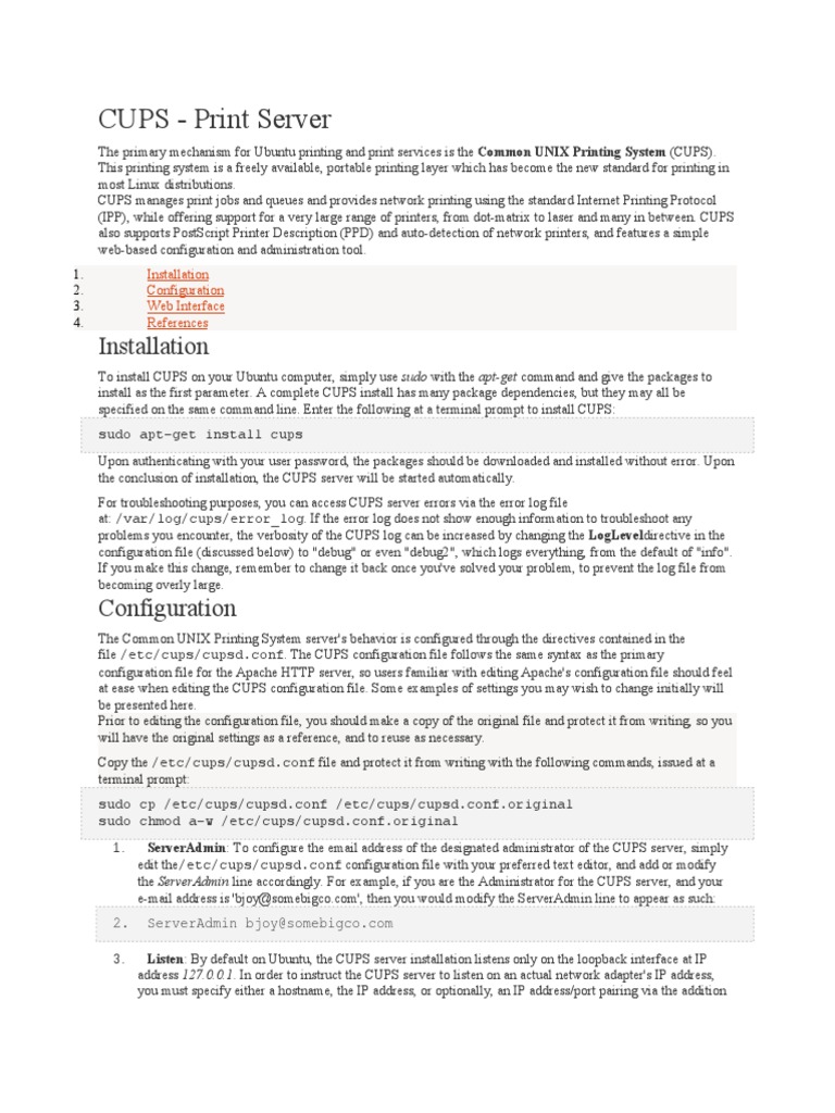 The Common U4&5 Printing System server3s behavior is configured through the directives contained in the file /etc/cups/cupsd.conf. The CUPS configuration file follo s the same synta" as the primary configuration file for the .pache 6TTP server, so users familiar ith editing .pache3s configuration file should feel at ease hen editing the CUPS configuration file. Some e"amples of settings you may ish to change initially ill be presented here. Prior to editing the configuration file, you should ma%e a copy of the original file and protect it from riting, so you ill have the original settings as a reference, and to reuse as necessary. Copy the /etc/cups/cupsd.conf file and protect it from riting ith the follo ing commands, issued at a terminal prompt0 sudo cp /etc/cups/cupsd.conf /etc/cups/cupsd.conf.original sudo chmod a-w /etc/cups/cupsd.conf.original 1. ServerAdmin0 To configure the email address of the designated administrator of the CUPS server, simply edit the/etc/cups/cupsd.conf configuration file ith your preferred te"t editor, and add or modify the ServerAdmin line accordingly. 1or e"ample, if you are the .dministrator for the CUPS server, and your e-mail address is 3b#oy7somebigco.com3, then you ould modify the Server.dmin line to appear as such0 ServerAdmin bjoy@somebigco.com Listen0 8y default on Ubuntu, the CUPS server installation listens only on the loopbac% interface at &P address 127.0.0.1. &n order to instruct the CUPS server to listen on an actual net or% adapter3s &P address, you must specify either a hostname, the &P address, or optionally, an &P address9port pairing via the addition