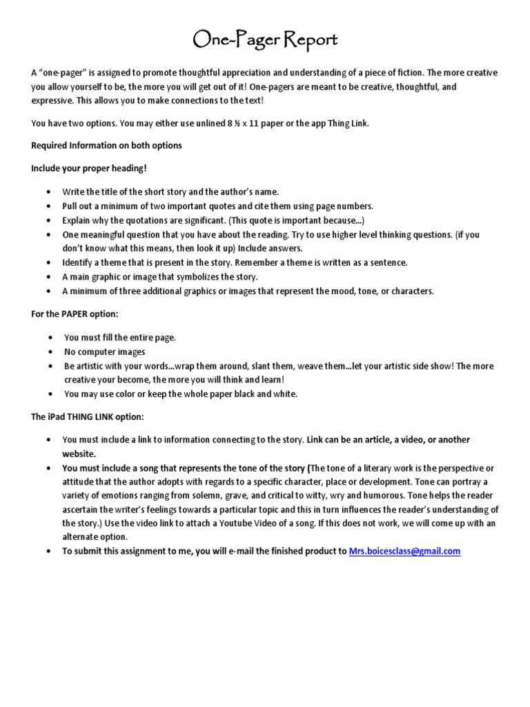 A one-pager is assigned to promote thoughtful appreciation and understanding of a piece of fiction. The more creative you allow yourself to be, the more you will get out of it! One-pagers are meant to be creative, thoughtful, and expressive. This allows you to make connections to the text! You have two options. You may either use unlined 8 x 11 paper or the app Thing Link. Required Information on both options Include your proper heading! Write the title of the short story and the authors name. Pull out a minimum of two important quotes and cite them using page numbers. Explain why the quotations are significant. (This quote is important because) One meaningful question that you have about the reading. Try to use higher level thinking questions. (if you dont know what this means, then look it up) Include answers. Identify a theme that is present in the story. Remember a theme is written as a sentence. A main graphic or image that symbolizes the story. A minimum of three additional graphics or images that represent the mood, tone, or characters.