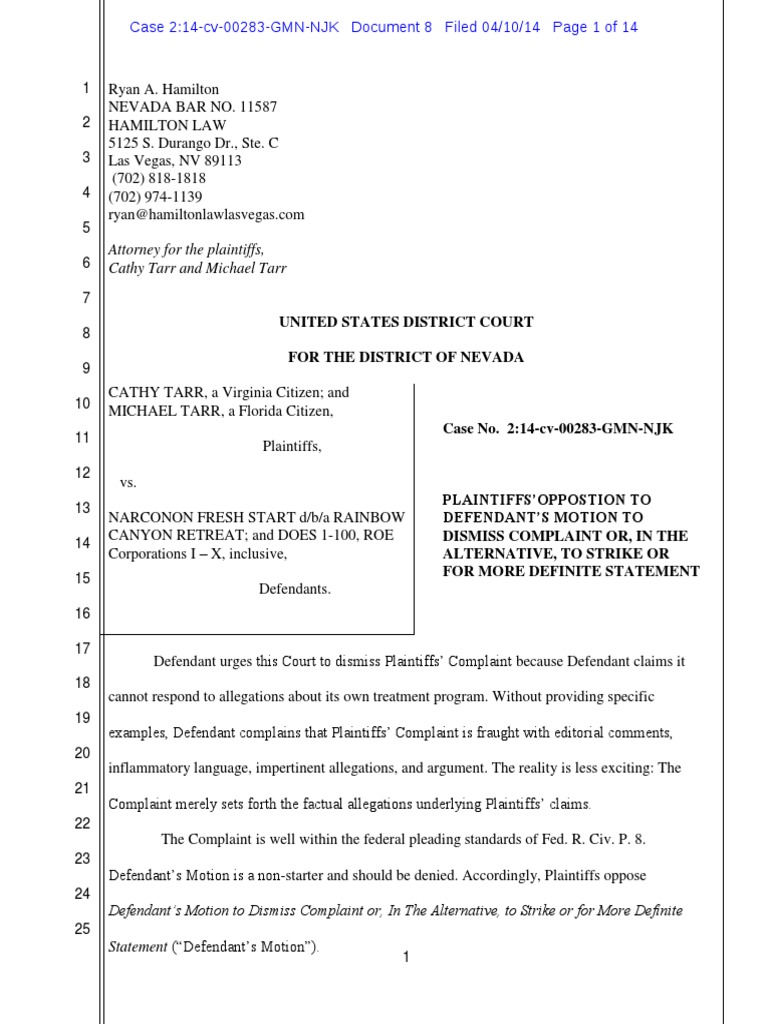 CATHY TARR, a Virginia Citizen; and MICHAEL TARR, a Florida Citizen, Plaintiffs, vs. NARCONON FRESH START d/b/a RAINBOW CANYON RETREAT; and DOES 1-100, ROE Corporations I
