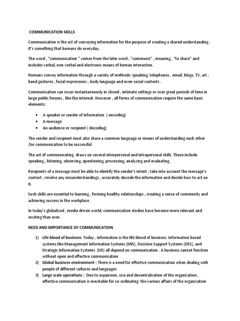 The sender and recipient must also share a common language or means of understanding each other ,for communication to be successful. The act of communicating draws on several interpersonal and intrapersonal skills. These include speaking , listening, observing, questioning, processing, analyzing and evaluating . Recipients of a message must be able to identify the senders intent , take into account the messages context , resolve any misunderstandings , accurately decode the information and decide how to act on it. Such skills are essential to learning , forming healthy relationships , creating a sense of community and achieving success in the workplace . In todays globalized , media driven world, communication studies have become more relevant and exciting than ever. NEED AND IMPORTANCE OF COMMUNICATION 1) Life blood of business: Today , information is the life blood of business. Information based systems like Management Information Systems (MIS), Decision Support Systems (DSS), and Strategic Information Systems (SIS) all depend on communication . A business cannot function without open and effective communication 2) Global business environment : There is a need for effective communication when dealing with people of different cultures and languages 3) Large scale operations : Due to expansion, size and decentralization of the organization , effective communication is inevitable for co-ordinating the various affairs of the organization