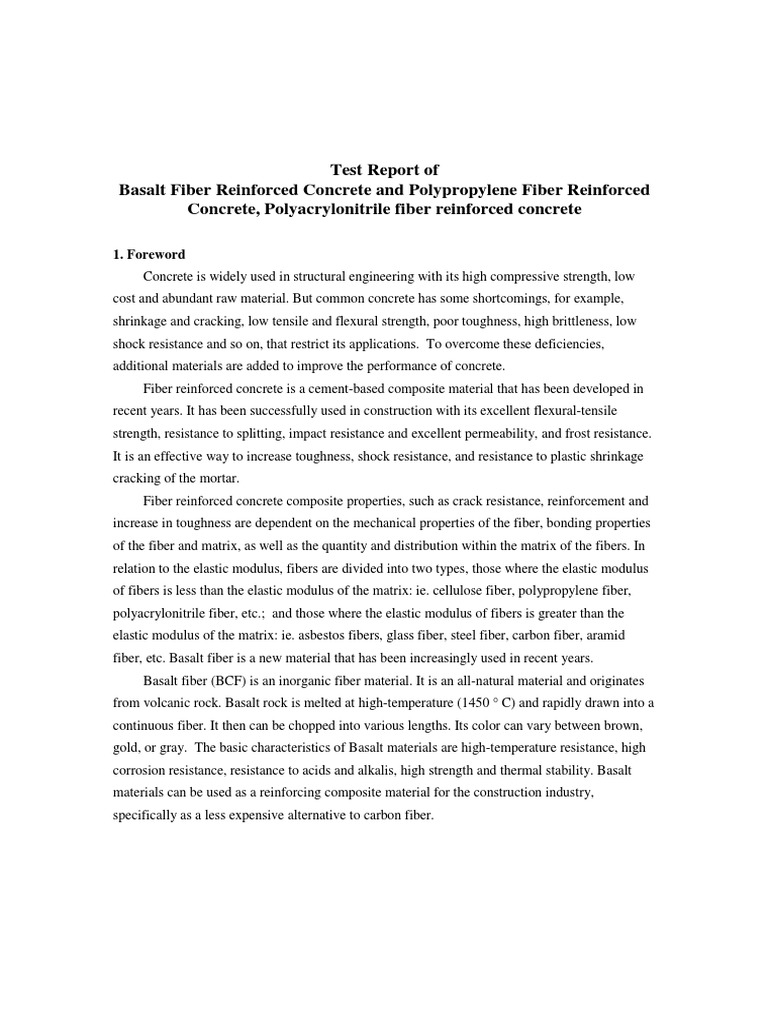 Test Report of Basalt Fiber Reinforced Concrete and Polypropylene Fiber Reinforced Concrete, Polyacrylonitrile fiber reinforced concrete