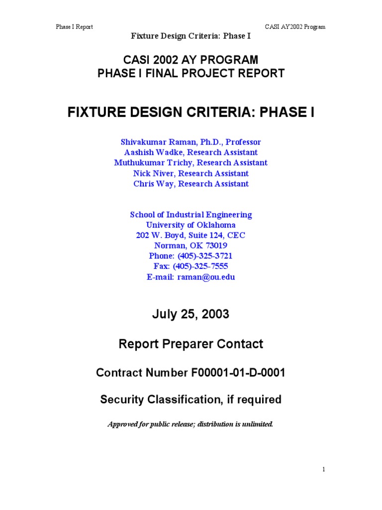 Fixture Design Criteria: Phase I Project Summary