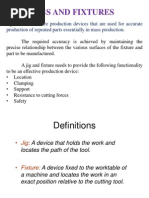 In the shrunk-fit chuck, the tool is inserted in the tool holder when it is hot and the tool is made integral with the tool holder. In the hydro-mechanical chuck the gripping force is generated by an external hydraulic pump on a self-locking mechanical chuck. The gripping force is twice that of a shrunk-fit chuck and thrice that of a hydraulic chuck. Choosing the type of chuck among the four types depends upon the number of parts to be produced, holding force required and the accuracy required. Such information is compiled in this section and presented sequentially with comparative statements between the types of chucks. Work holding chucks: Work-holding chucks are usually used in Lathes. Chucks are either manual or power actuated. Air and oil is used to transfer power in pneumatic and hydraulic chucks respectively. The numbers of jaws differ according to the usage. Two-jaw, three-jaw, four-jaw and six-jaw chucks are available and they are chosen depending upon the shape of the product and the type of operation required. Working principle of all the types of chucks is explained in this section. The information of different manufacturers of chucks along with their product varieties is also provided for ready reference. DESIGN OF JIGS AND FIXTURES: This section explains the designing of Jigs and fixtures and a visual presentation is prepared to explain the details. The basic difference between jig and fixture is that the former locates and holds the work piece while also guiding the cutting tool, whereas the latter just locates and clamps the work piece. The jig may or may not be fastened to the machine table whereas the fixture should be fastened to the machine table precisely. The points to be considered before deciding to go for jigs and fixtures, as well as the theoretical principles for designing of jigs and fixtures are explained next. As the initial cost involved in any new process or change of process is an added expense it should be justified by its returns. As far as jigs and fixtures are concerned, the cumulative output in terms of production units, manufacturing time, labor required and ease of operation is more important. During the design stage, technical points such as principle and method of location, cutter action on the work, locators and clamps to be used, body design, provision for chip clearance should each be adequately considered. The suitable off-set blocks and gauges will bring the cutter to the cutting point very closely within a short time which will reduce the total manufacturing time during mass or batch production. Utilizing the concept of standardization, fool proofing will reduce the manufacturing cost of jigs and fixtures. Similarly, suitable choice of operating mechanism of the jigs and fixtures according to the working environment will also help reduce the manufacturing cost. All these are explained in this section through visual presentation. Different types of jigs used for drilling, boring, and welding are shown in the presentation. Similarly various types of fixtures used for milling, drilling, boring, grinding, assembly and inspection are also shown.