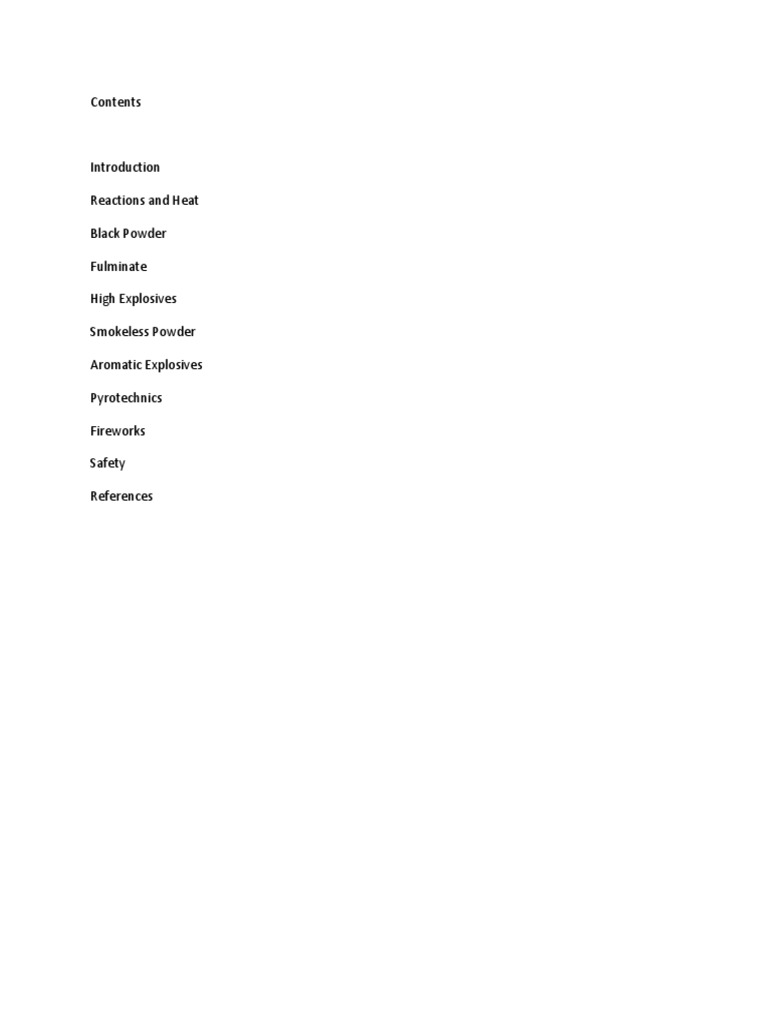Introduction Reactions and Heat Black Powder Fulminate High Explosives Smokeless Powder Aromatic Explosives Pyrotechnics Fireworks Safety References