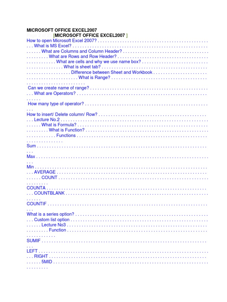 . . . . . . . . . . . . . . . . . . . . . . . . . . . . . . . . . . . . . . . . . . . . . . . . . . . . . . . . . . . . . What are Columns and Column Header? . . . . . . . . . . . . . . . . . . . . . . . . . . . . . . . . . . . . . . . . . . . . What are Rows and Row Header? . . . . . . . . . . . . . . . . . . . . . . . . . . . . . . . . . . . . . . . . . . . . . . . . . What are cells and why we use name box? . . . . . . . . . . . . . . . . . . . . . . . . . . . . . . . . . . . . . . . . . . What is sheet tab? . . . . . . . . . . . . . . . . . . . . . . . . . . . . . . . . . . . . . . . . . . . . . . . . . . . . . . . . . . . . . Difference between Sheet and Workbook . . . . . . . . . . . . . . . . . . . . . . . . . . . . . . . . . . . . . . . . . . . What is Range? . . . . . . . . . . . . . . . . . . . . . . . . . . . . . . . . . . . . . . . ........................ Can we create name of range? . . . . . . . . . . . . . . . . . . . . . . . . . . . . . . . . . . . . . . . . . . . . . . . . . . . What are Operators? . . . . . . . . . . . . . . . . . . . . . . . . . . . . . . . . . . . . . . . . . . . . . . . . . . . . . ...... How many type of operator? . . . . . . . . . . . . . . . . . . . . . . . . . . . . . . . . . . . . . . . . . . . . . . . . . . ... How to insert/ Delete column/ Row? . . . . . . . . . . . . . . . . . . . . . . . . . . . . . . . . . . . . . . . . . . . . . . . Lecture No.2 . . . . . . . . . . . . . . . . . . . . . . . . . . . . . . . . . . . . . . . . . . . . . . . . . . . . . . . . . . . . . . . . . . What is Formula? . . . . . . . . . . . . . . . . . . . . . . . . . . . . . . . . . . . . . . . . . . . . . . . . . . . . . . . . . . . . . . What is Function? . . . . . . . . . . . . . . . . . . . . . . . . . . . . . . . . . . . . . . . . . . . . . . . . . . . . . . . . . . . . . . Functions . . . . . . . . . . . . . . . . . . . . . . . . . . . . . . . . . . . . . . . . . . . . . . . . . . . . . ............... Sum . . . . . . . . . . . . . . . . . . . . . . . . . . . . . . . . . . . . . . . . . . . . . . . . . . . . . . . . . . . . . . . . . . . . . ... Max . . . . . . . . . . . . . . . . . . . . . . . . . . . . . . . . . . . . . . . . . . . . . . . . . . . . . . . . . . . . . . . . . . . . . . ... Min . . . . . . . . . . . . . . . . . . . . . . . . . . . . . . . . . . . . . . . . . . . . . . . . . . . . . . . . . . . . . . . . . . . . . . . . . AVERAGE . . . . . . . . . . . . . . . . . . . . . . . . . . . . . . . . . . . . . . . . . . . . . . . . . . . . . . . . . . . . . . . . . . . COUNT . . . . . . . . . . . . . . . . . . . . . . . . . . . . . . . . . . . . . . . . . . . . . . . . . . . . . . . . . . . . . ......... COUNTA . . . . . . . . . . . . . . . . . . . . . . . . . . . . . . . . . . . . . . . . . . . . . . . . . . . . . . . . . . . . . . . . . . . . COUNTBLANK . . . . . . . . . . . . . . . . . . . . . . . . . . . . . . . . . . . . . . . . . . . . . . . . . . . . . . . . . . ...... COUNTIF . . . . . . . . . . . . . . . . . . . . . . . . . . . . . . . . . . . . . . . . . . . . . . . . . . . . . . . . . . . . . . . . . ... What is a series option? . . . . . . . . . . . . . . . . . . . . . . . . . . . . . . . . . . . . . . . . . . . . . . . . . . . . . . . . . Custom list option . . . . . . . . . . . . . . . . . . . . . . . . . . . . . . . . . . . . . . . . . . . . . . . . . . . . . . . . . . . . . . Lecture No3 . . . . . . . . . . . . . . . . . . . . . . . . . . . . . . . . . . . . . . . . . . . . . . . . . . . . . . . . . . . . . . . . . . Function . . . . . . . . . . . . . . . . . . . . . . . . . . . . . . . . . . . . . . . . . . . . . . . . . . . . . . . . . ............ SUMIF . . . . . . . . . . . . . . . . . . . . . . . . . . . . . . . . . . . . . . . . . . . . . . . . . . . . . . . . . . . . . . . . . . . ... LEFT . . . . . . . . . . . . . . . . . . . . . . . . . . . . . . . . . . . . . . . . . . . . . . . . . . . . . . . . . . . . . . . . . . . . . . . . RIGHT . . . . . . . . . . . . . . . . . . . . . . . . . . . . . . . . . . . . . . . . . . . . . . . . . . . . . . . . . . . . . . . . . . . . . . 5MID . . . . . . . . . . . . . . . . . . . . . . . . . . . . . . . . . . . . . . . . . . . . . . . . . . . . . . . . . . . . . . . .........