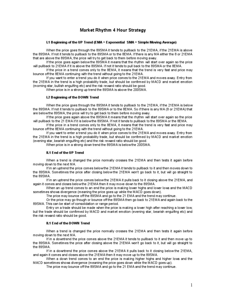 When the price goes through the 89SMA it tends to pullback to the 21EMA, if the 21EMA is above the 89SMA. f not it tends to pullback to the 89SMA or to the 8EMA. f there is an! MA either the 8 or 21EMA that are above the 89SMA, the price "ill tr! to get back to the# before #oving a"a!. f the price goes again belo" the 89SMA it #eans that the rh!th# "ill start over again so the price "ill pullback to 21EMA if it is above the 89SMA. f not it tends to pull back to the 89SMA or the 8EMA. f the price in a trend co#es onl! to the 8EMA, it #eans that the trend is ver! fast and price #a! bounce off the 8EMA continuing "ith the trend "ithout going to the 21EMA. f !ou "ant to enter a trend !ou do it "hen price co#es to the 21EMA and #oves a"a!. Entr! fro# the 21EMA in the trend is a high probabilit! trade, but should be confir#ed b! MA$% and #arket e#otion &#orning star, bullish engulfing etc' and the risk re"ard ratio should be good. When price is in a strong up trend the 89SMA is above the 2((SMA. I.& Beginning of the '()* Trend When the price goes through the 89SMA it tends to pullback to the 21EMA, if the 21EMA is belo" the 89SMA. f not it tends to pullback to the 89SMA or to the 8EMA. So if there is an! MA &8 or 21EMA' that are belo" the 89SMA, the price "ill tr! to get back to the# before #oving a"a!. f the price goes again above the 89SMA it #eans that the rh!th# "ill start over again so the price "ill pullback to the 21 EMA if it is belo" the 89SMA. f not it tends to pullback to the 89SMA or the 8EMA. f the price in a trend co#es onl! to the 8EMA, it #eans that the trend is ver! fast and price #a! bounce off the 8EMA continuing "ith the trend "ithout going to the 21EMA. f !ou "ant to enter a trend !ou do it "hen price co#es to the 21EMA and #oves a"a!. Entr! fro# the 21EMA in the trend is a high probabilit! trade, but should be confir#ed b! MA$% and #arket e#otion &evening star, bearish engulfing etc' and the risk re"ard ratio should be good. When price is in a strong do"n trend the 89SMA is belo" the 2((SMA. II.1 End of the UP Trend When a trend is changed the price nor#all! crosses the 21EMA and then tests it again before #oving do"n to the ne)t MA. f in an uptrend the price co#es belo" the 21EMA it tends to pullback to it and then #oves do"n to the 89SMA. So#eti#es the price after closing belo" the 21EMA "on*t go back to it, but "ill go straight to the 89SMA. f in an uptrend the price co#es belo" the 21EMA it pulls back to it closing above the 21EMA, and again it co#es and closes belo" the 21EMA then it #a! #ove do"n to the 89SMA. When an up trend co#es to an end the price is #aking lo"er highs and lo"er lo"s and the MA$% so#eti#es sho"s divergence &#eaning the price goes up "hile the MA$% goes do"n'. +he price #a! bounce off the 89SMA and go to the 21 EMA and the trend #a! continue. ,r the price #a! go though or bounce off the 89SMA then go back to 21EMA and again back to the 89SMA. +his can be start of consolidation or range period. Entr! on a trade should be #ade "hen the price is #aking a lo"er high after reaching a lo"er lo", but the trade should be confir#ed b! MA$% and #arket e#otion &evening star, bearish engulfing etc' and the risk re"ard ratio should be good. II.1 End of the '()* Trend When a trend is changed the price nor#all! crosses the 21EMA and then tests it again before #oving do"n to the ne)t MA. f in a do"ntrend the price co#es above the 21EMA it tends to pullback to it and then #ove up to the 89SMA. So#eti#es the price after closing above the 21EMA "on*t go back to it, but "ill go straight to the 89SMA. f in a do"ntrend the price co#es above the 21EMA it pulls back to it closing belo" the 21EMA, and again it co#es and closes above the 21EMA then it #a! #ove up to the 89SMA. When a do"n trend co#es to an end the price is #aking higher highs and higher lo"s and the MA$% so#eti#es sho"s divergence &#eaning the price goes do"n "hile the MA$% goes up'. +he price #a! bounce off the 89SMA and go to the 21 EMA and the trend #a! continue.
