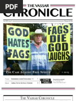 kicked off more than 20 years of anti-gay picketing and nationwide disapproval. It makes sense that Phelps and his gang of frothy-mouthed homophobes started with Gage Park; local and apparently crawling with homosexuals, Gage was the ideal stage for Phelps to launch his career in looking foolish while railing against gay people. Since then, the Westboro Baptist Church has been widely labeled as a hate group and has prompted counter-protests across the country. Phelps even managed to get himself and his church banned from Canada and the United Kingdom, demonstrating to Americans that his particular brand of nastiness is unwelcome among our nations peers and hinting at the ever-mounting shift away from statesanctioned bigotry. Vassar College owes particular gratitude to the late reverend and his church. In February of 2013, the Westboro Baptist Church provided both our campus community and those surrounding us with a wonderful opportunity to join together for a day of counter-protest, examination of privilege in our bubble of general LGBTQ acceptance, and lots of public homosexual kissing. The general feeling on campus leading up to and following the Westboro Baptist Block Party was of pride and security in our knowledge of right and wrong; we owe it to Phelps and his almost cartoonish hatred for serving as an impetus to action. Vassars response to the Westboro Baptist Churchs protest is but a small-scale version of the United States