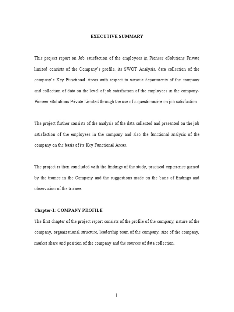 This project report on Job satisfaction of the employees in Pioneer eSolutions Private limited consists of the Companys profile, its SWOT Analysis, data collection of the companys ey !unctional Areas "ith respect to various departments of the company