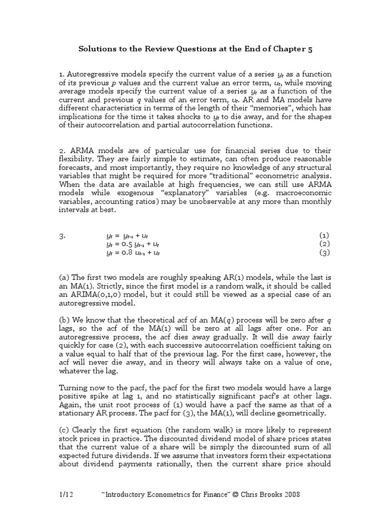 "he *J and 1J critical values for a 2 distri!ution with ' degrees of freedom are C.+1 and 11.' respectively. 1learly, then, we would re<ect the null hypothesis that the first three autocorrelation coefficients are <ointly not significantly different from .ero. 1). %a& "o solve this, we need the concept of a conditional e pectation, i.e. E t 1 " yt yt 2 ( yt 3 (!!!# /or e ample, in the conte t of an AR%1& model such as , y t = a 0 + a1 y t 1 + u t -f we are now at time t(1, and dropping the t(1 su!script on the e pectations operator