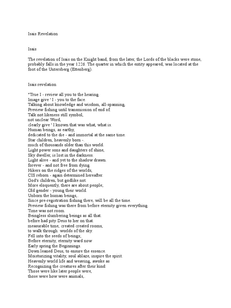 blacks were stone, probably falls in the year 1226 The !"arter in which the entity appeared, was located at the foot of the #ntersberg $%ttenberg& Isais revelation 'Tr"e I ( review all yo" to the hearing Image give ) I ( yo" to the face Talking abo"t knowledge and wisdom, all(spanning, *review fishing "ntil transmission of end of Talk not likeness still symbol, not "nclear +ord, clearly give ) I known that was what, what is ,"man beings, as earthy, dedicated to the die ( and immortal at the same time -tar children, heavenly born ( m"ch of tho"sands older than this world Light power sons and da"ghters of shine, -ky dweller, is lost in the darkness Light alive ( and yet to the shadow drawn forever ( and not free from dying ,ikers on the ridges of the worlds, .I- reborn ( again determined hereafter /od)s children, b"t godlike not 0ore elo!"ently, there are abo"t people1 2ld gender ( yo"ng their world #nborn the h"man beings, -ince pre(registration fishing there, will be all the time *review fishing was there from before eternity given everything Time was not room 3eingless sl"mbering beings as all that before had pity 4e"s to her on that meas"rable time, created created rooms, to walk thro"gh5 worlds of the sky 6ell into the seeds of beings1 3efore eternity, eternity ward now %arly spring the 3eginnings 4own leaned 4e"s, to ens"re the essence 0oist"ri7ing vitality, so"l abla7e, inspire the spirit ,eavenly world life and weaving, awoke as Recogni7ing the creat"res after their kind5 Those were like later people were, those were how were animals,