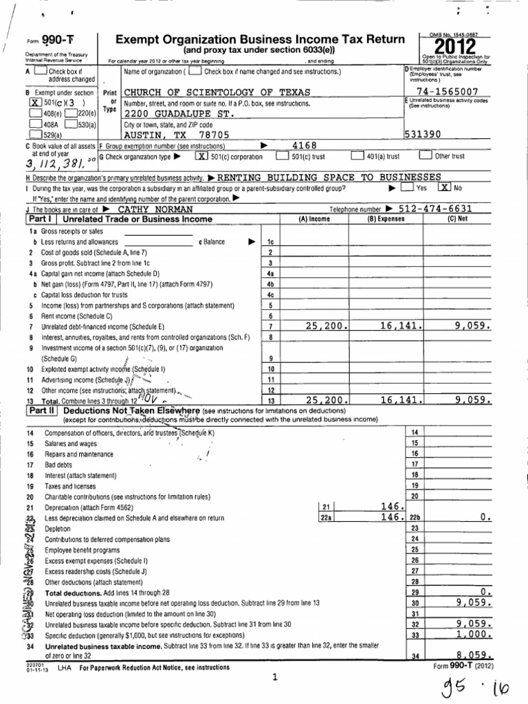 Save 2012 Church of Scientology Texas 990-T return For Later