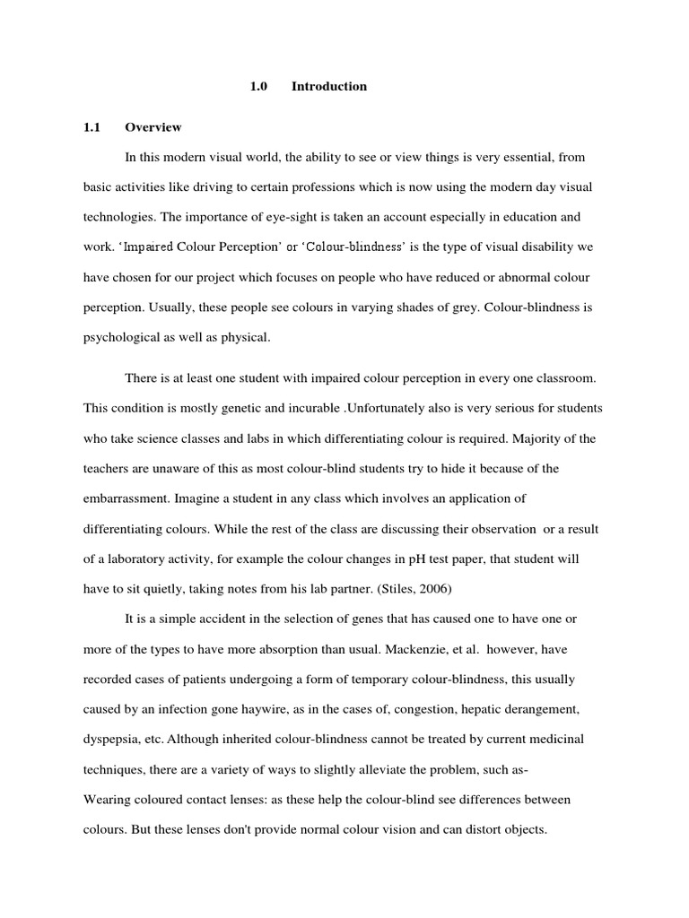 In this modern visual world, the ability to see or view things is very essential, from basic activities like driving to certain professions which is now using the modern day visual technologies. The importance of eye-sight is taken an account especially in education and work. Impaired Colour Perception or Colour-blindness is the type of visual disability we have chosen for our project which focuses on people who have reduced or abnormal colour perception. Usually, these people see colours in varying shades of grey. Colour-blindness is psychological as well as physical. There is at least one student with impaired colour perception in every one classroom. This condition is mostly genetic and incurable .Unfortunately also is very serious for students who take science classes and labs in which differentiating colour is required. Majority of the teachers are unaware of this as most colour-blind students try to hide it because of the embarrassment. Imagine a student in any class which involves an application of differentiating colours. While the rest of the class are discussing their observation or a result of a laboratory activity, for example the colour changes in pH test paper, that student will have to sit quietly, taking notes from his lab partner. (Stiles, 2006) It is a simple accident in the selection of genes that has caused one to have one or more of the types to have more absorption than usual. Mackenzie, et al. however, have recorded cases of patients undergoing a form of temporary colour-blindness, this usually caused by an infection gone haywire, as in the cases of, congestion, hepatic derangement, dyspepsia, etc. Although inherited colour-blindness cannot be treated by current medicinal techniques, there are a variety of ways to slightly alleviate the problem, such asWearing coloured contact lenses: as these help the colour-blind see differences between colours. But these lenses don't provide normal colour vision and can distort objects.