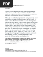 -Wearing glasses that block glare: people with colour vision problems can see differences between colours better when there is less glare and brightness.Non-inherited colour blindness is caused by the following factors: Aging, Eye problems, glaucoma, macular degeneration, cataracts, diabetic retinopathy, an Injury to the eye, or simply due to the Side effects of some medicines. Thus, the only possible prevention method for acquired colour-blindness is to help reduce the chances of getting acquired colour blindness, by discussing the use of prescribed medicines with a doctor. (George, 1855) However, there are many tools and aids to help colour-blind people to perform no different than normal sighted people in their daily lives. The device which we will be mainly discussing in this paper is Lens with transparent 3-coloour strip. 1.2 Objectives of the study The purpose or the main objective of this paper is To help people who are more interested in understanding of Impaired Colour Perception or Colour-blindness and To develop ideas of improvements which can possibly be made for currently available aids for patients with this disability using todays technology.