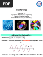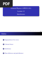SUPERPOSITION 333334 INTERFERENCE 5nterference of t o overlappin) travellin) ave! depend! on# relative p-a!e! of t-e t o ave! relative amplitude! of t-e t o ave! %t a point, if eac- ave reac-e! a ma6 at t-e !ame time (y1 = yma61, y2 = yma62) ave! are ! "#ase (p-a!e difference bet een ave! t o ave! = 0) )reate!t po!!ible amplitude ( yma61 + yma62) $%&&' co!st(%ct ve !te($e(e!ce %t a point, one ave reac-e! a ma6 and t-e ot-er a min at t-e !ame time (y1 = +yma61, y2 = 3yma62) ave! are o%t "#ase (p-a!e difference bet een t o ave! = rad) lo e!t po!!ible amplitude ( ym1 3 ym2) $%&&' dest(%ct ve !te($e(e!ce 0 7 p-a!e difference 7 rad or 7 p-a!e difference 7 2 intermediate interference A "#ase d $$e(e!ce o$ ) (ad co((es"o!ds to a s# $t o$ o!e wave&e!*t# +etwee! two waves. Fo( n = 0, 1, 2, $ $%&&' co!st(%ct ve !te($e(e!ce "#ase d $$e(e!ce , n $%&&' dest(%ct ve !te($e(e!ce "#ase d $$e(e!ce , -n . /0