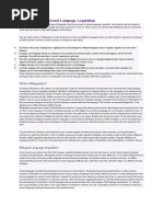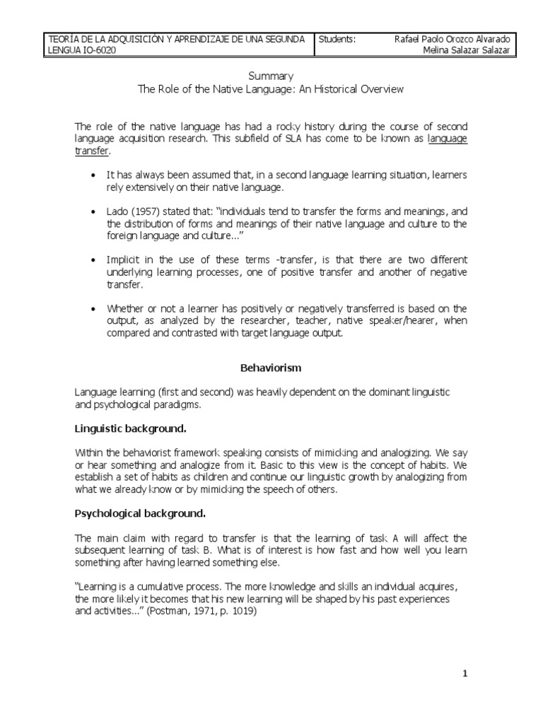 The role of the native language has had a rocky history during the course of second language acquisition research. This subfield of SLA has come to be known as language transfer. It has always been assumed that, in a second language learning situation, learners rely extensively on their native language. Lado (1957) stated that: individuals tend to transfer the forms and meanings, and the distribution of forms and meanings of their native language and culture to the foreign language and culture Implicit in the use of these terms -transfer, is that there are two different underlying learning processes, one of positive transfer and another of negative transfer. Whether or not a learner has positively or negatively transferred is based on the output, as analyzed by the researcher, teacher, native speaker/hearer, when compared and contrasted with target language output. Behaviorism Language learning (first and second) was heavily dependent on the dominant linguistic and psychological paradigms. Linguistic background. Within the behaviorist framework speaking consists of mimicking and analogizing. We say or hear something and analogize from it. Basic to this view is the concept of habits. We establish a set of habits as children and continue our linguistic growth by analogizing from what we already know or by mimicking the speech of others. Psychological background. The main claim with regard to transfer is that the learning of task A will affect the subsequent learning of task B. What is of interest is how fast and how well you learn something after having learned something else. Learning is a cumulative process. The more knowledge and skills an individual acquires, the more likely it becomes that his new learning will be shaped by his past experiences and activities (Postman, 1971, p. 1019)