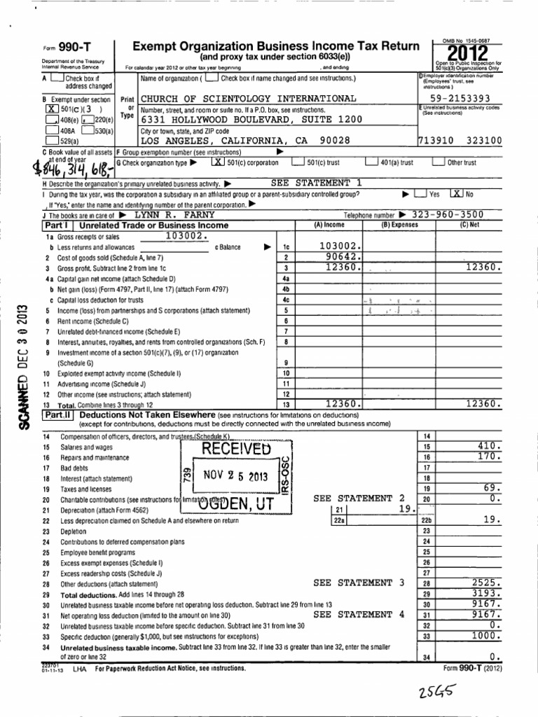 Church of Scientology International 2012 Book Value $846,314,618